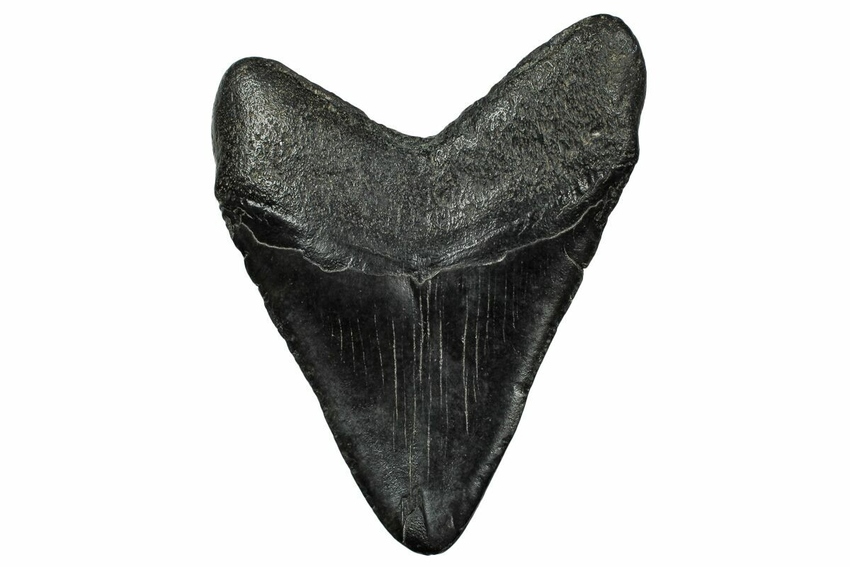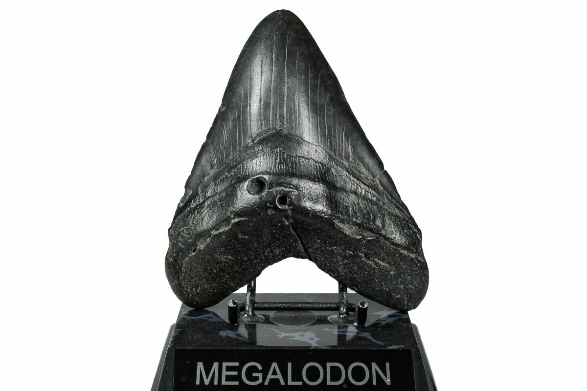 The standard measure for megalodon teeth is slant height, or the longest edge of the tooth. Adult megalodon teeth were typically in the 4 to 5 inch range: teeth over 6 inches are rare and represent super-sized individuals. Only a handful of teeth have ever been found over seven inches.