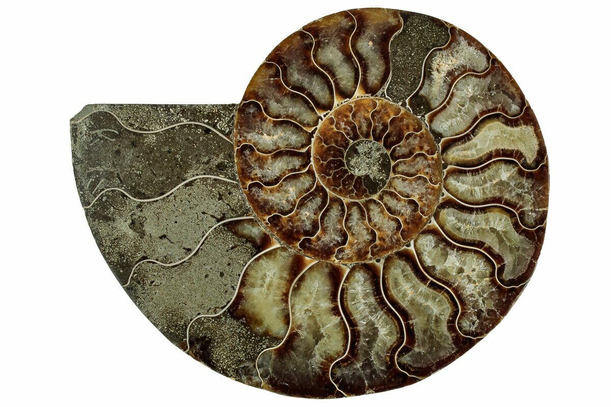 Here is a beautiful, 5.35" wide, cut and polished Cleoniceras ammonite fossil from Madagascar. These ammonites are Cretaceous in age, approximately 110 million years old. This specimen exhibits gorgeous mineralization within the chambers, each separated by white calcite septa (divisions). This highly polished, exotic ammonite makes a superb display piece with tremendous historical appeal.