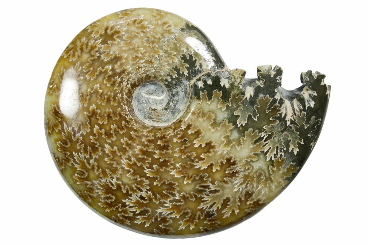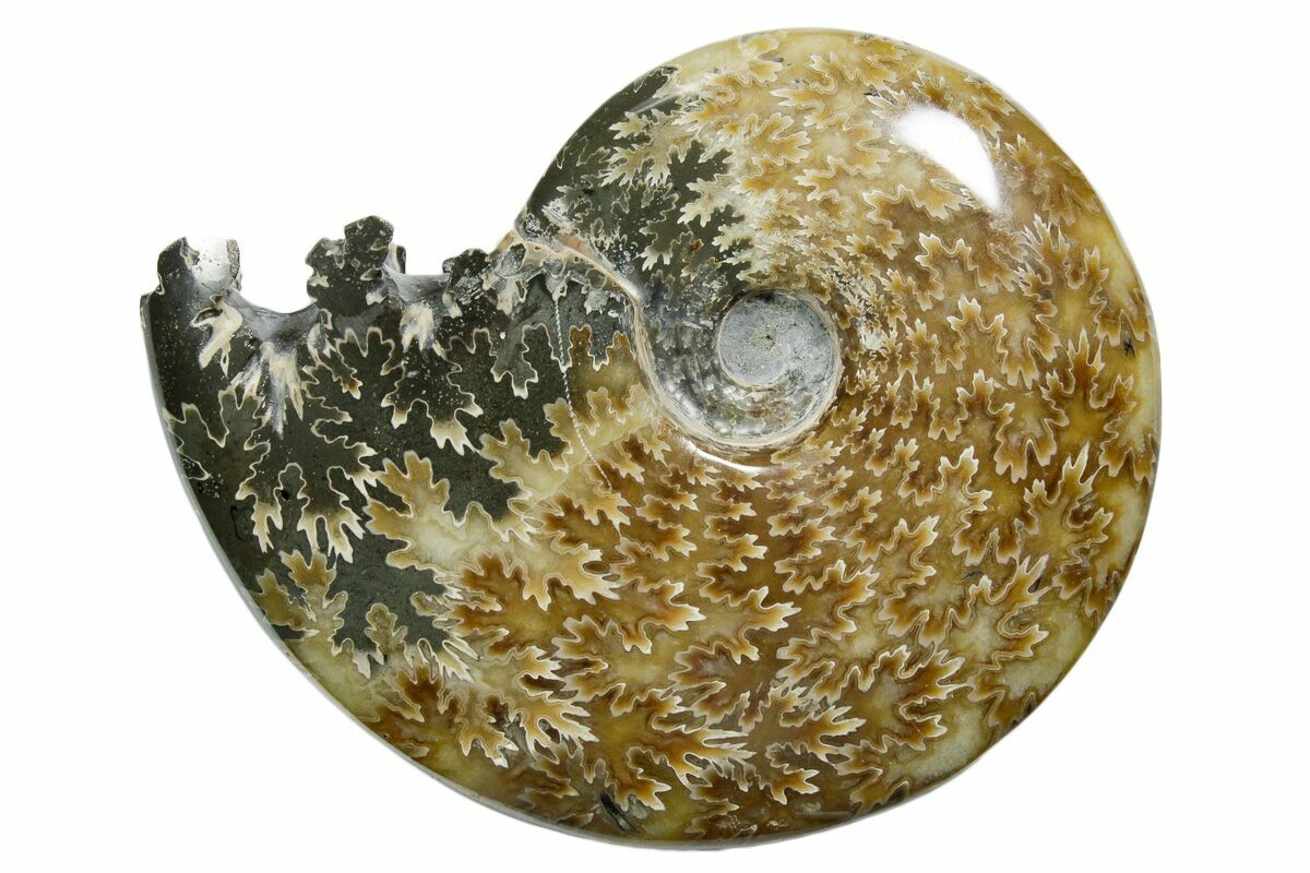 This is a 5.35" wide polished ammonite of the genus Cleoniceras, collected in Madagascar. It is absolutely gorgeous, displaying a distinctive "oak-leaf" suture pattern on the surface. This 110 million year old ammonite is truly a natural work of art, with the end chamber having been exposed.