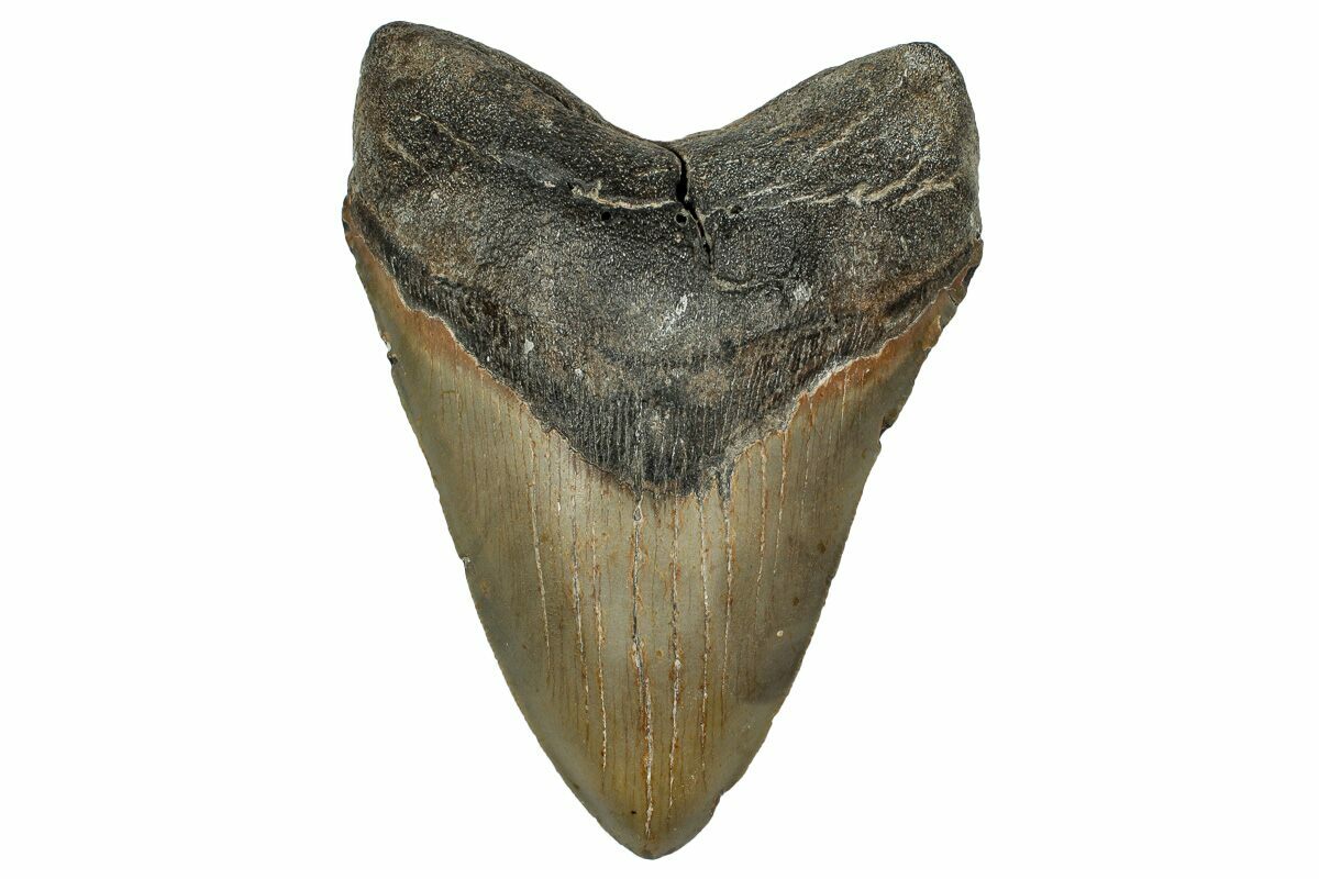 The standard measure for megalodon teeth is slant height, or the longest edge of the tooth. Adult megalodon teeth were typically in the 4 to 5 inch range: teeth over 6 inches are rare and represent super-sized individuals. Only a handful of teeth have ever been found over seven inches.