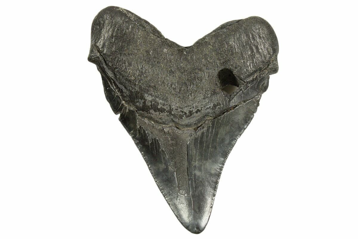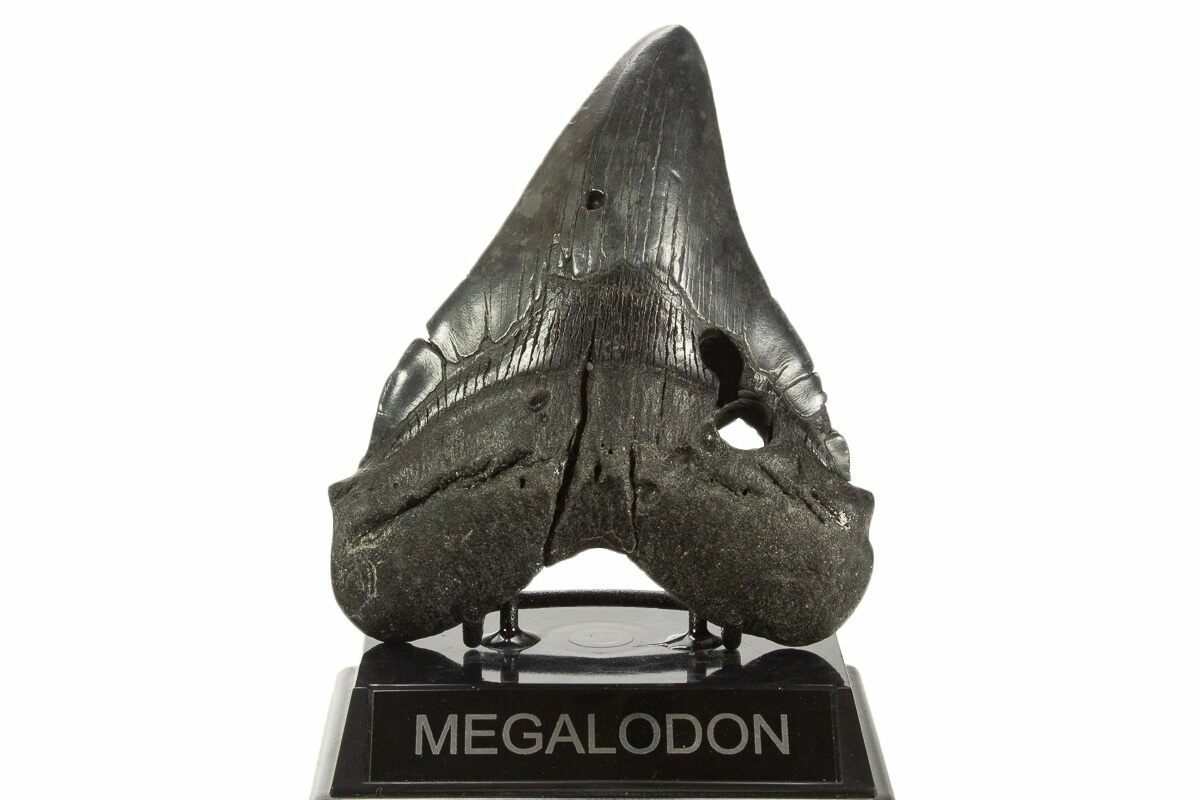 The standard measure for megalodon teeth is slant height, or the longest edge of the tooth. Adult megalodon teeth were typically in the 4 to 5 inch range: teeth over 6 inches are rare and represent super-sized individuals. Only a handful of teeth have ever been found over seven inches.