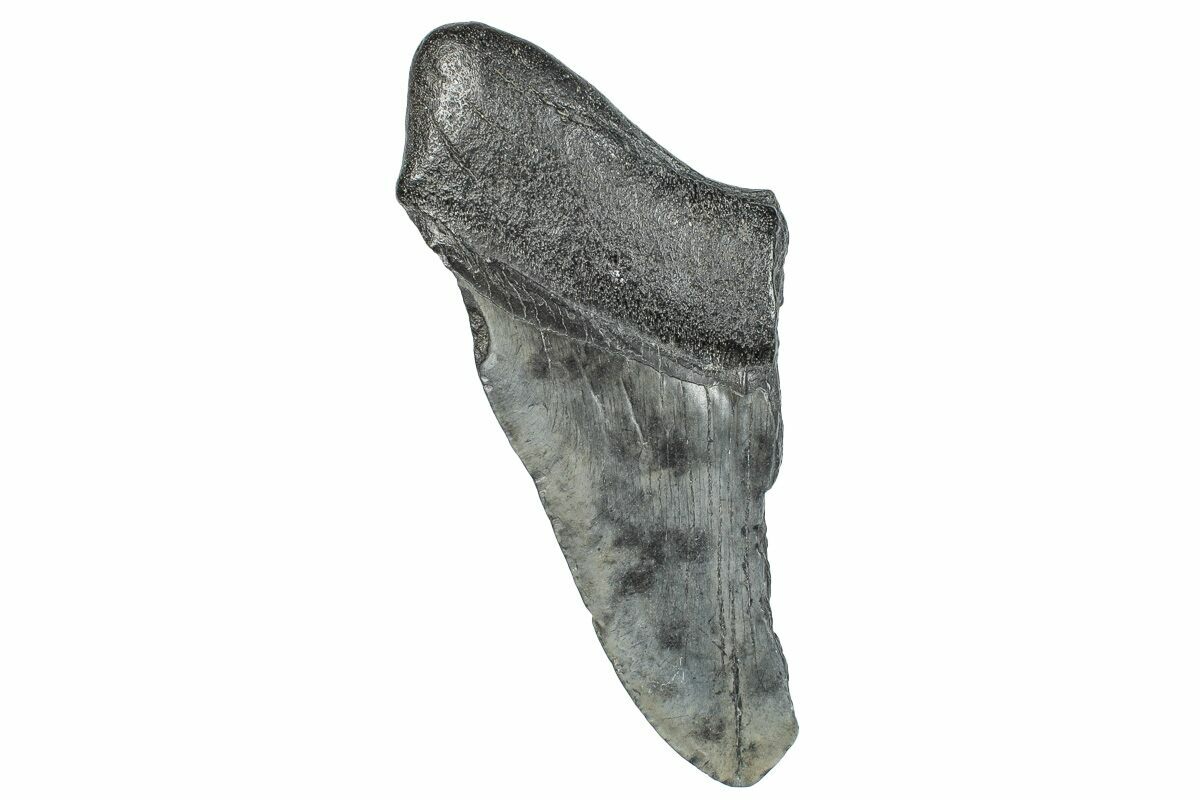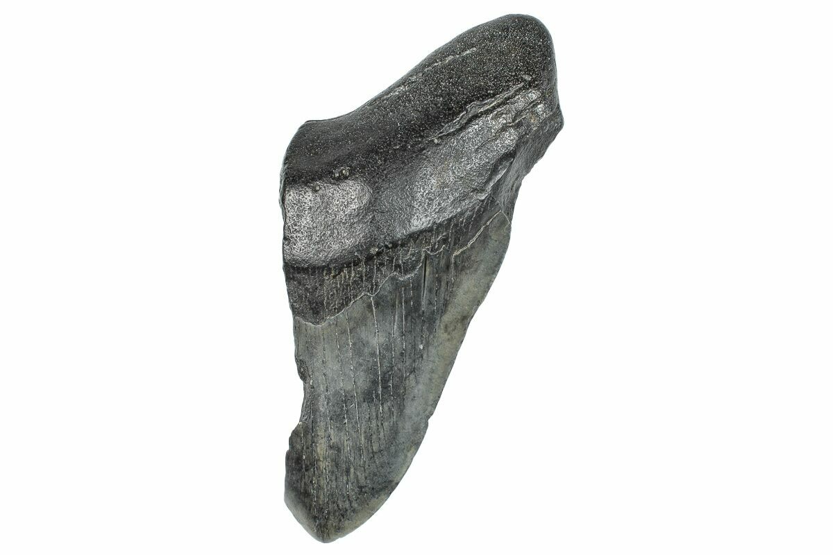 The standard measure for megalodon teeth is slant height, or the longest edge of the tooth. Adult megalodon teeth were typically in the 4 to 5 inch range: teeth over 6 inches are rare and represent super-sized individuals. Only a handful of teeth have ever been found over seven inches.