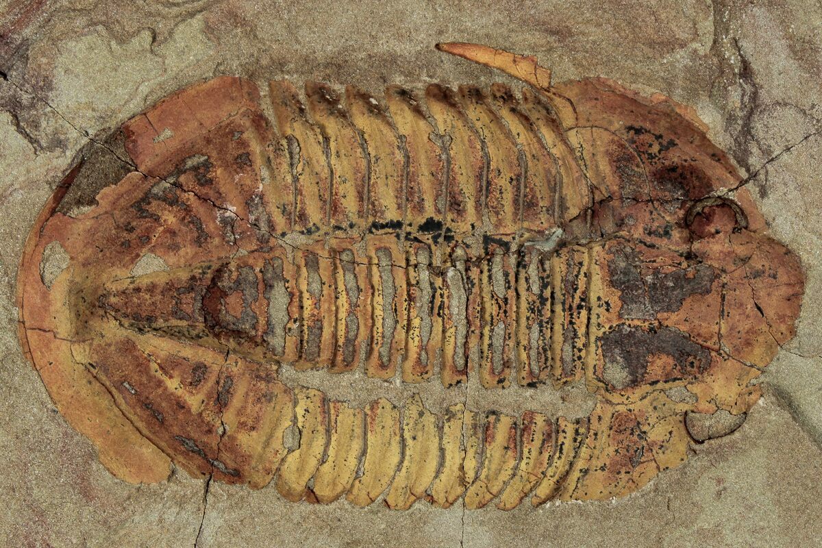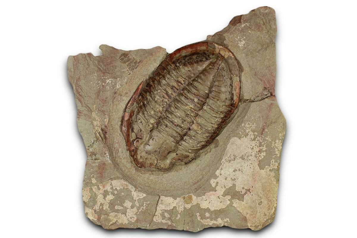 This is a 5.4" long Asaphid trilobite (Ogyginus sp.) from the Fezouata Formation of Morocco. It has a colorful preservation which stands out nicely against the tan shale. The negative impression of this trilobite is also included with purchase. There is no restoration on this fossil.
