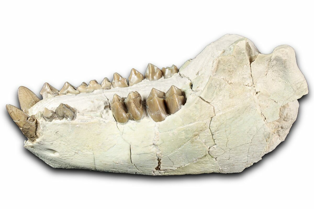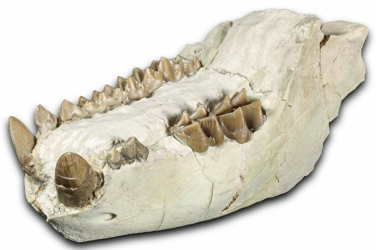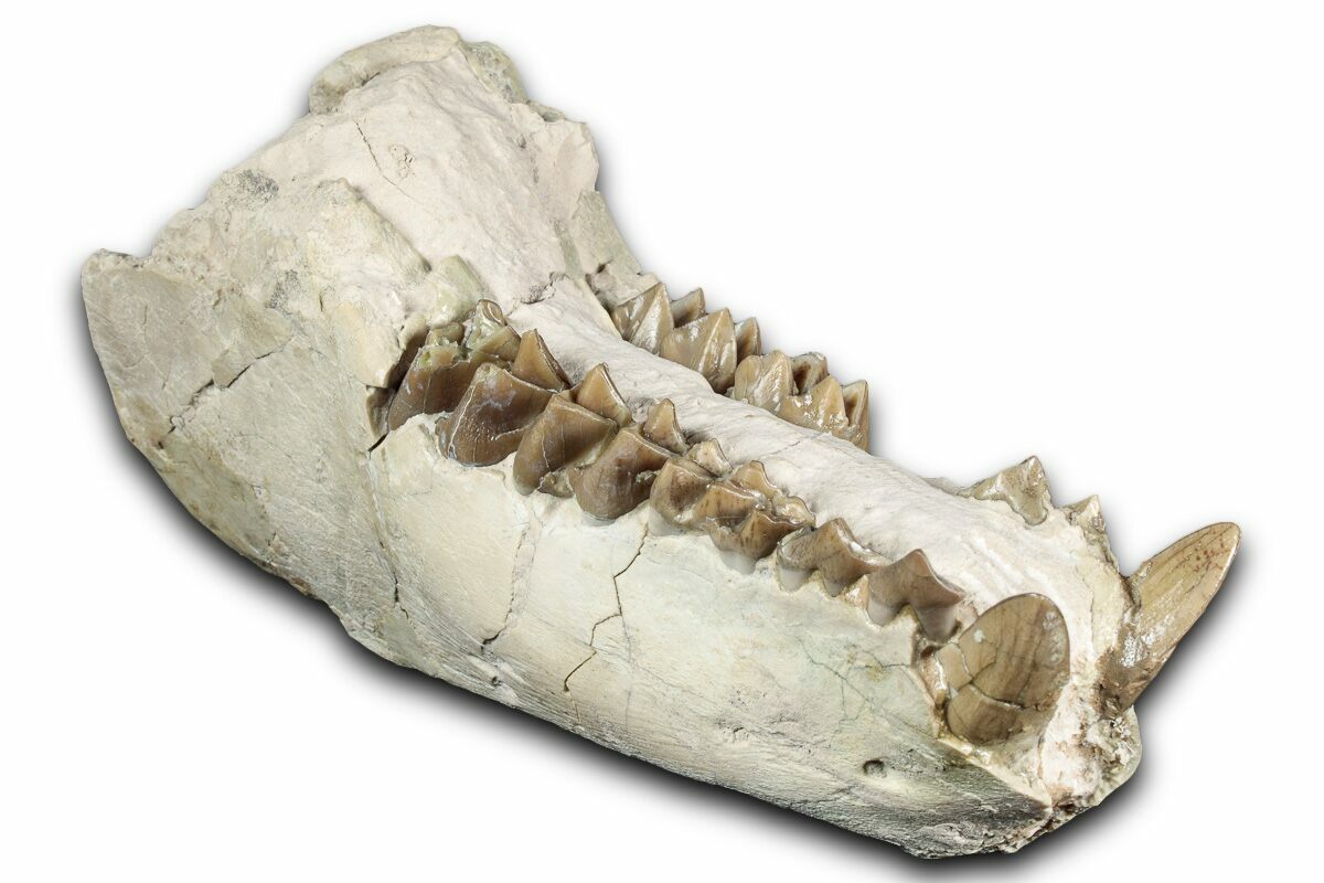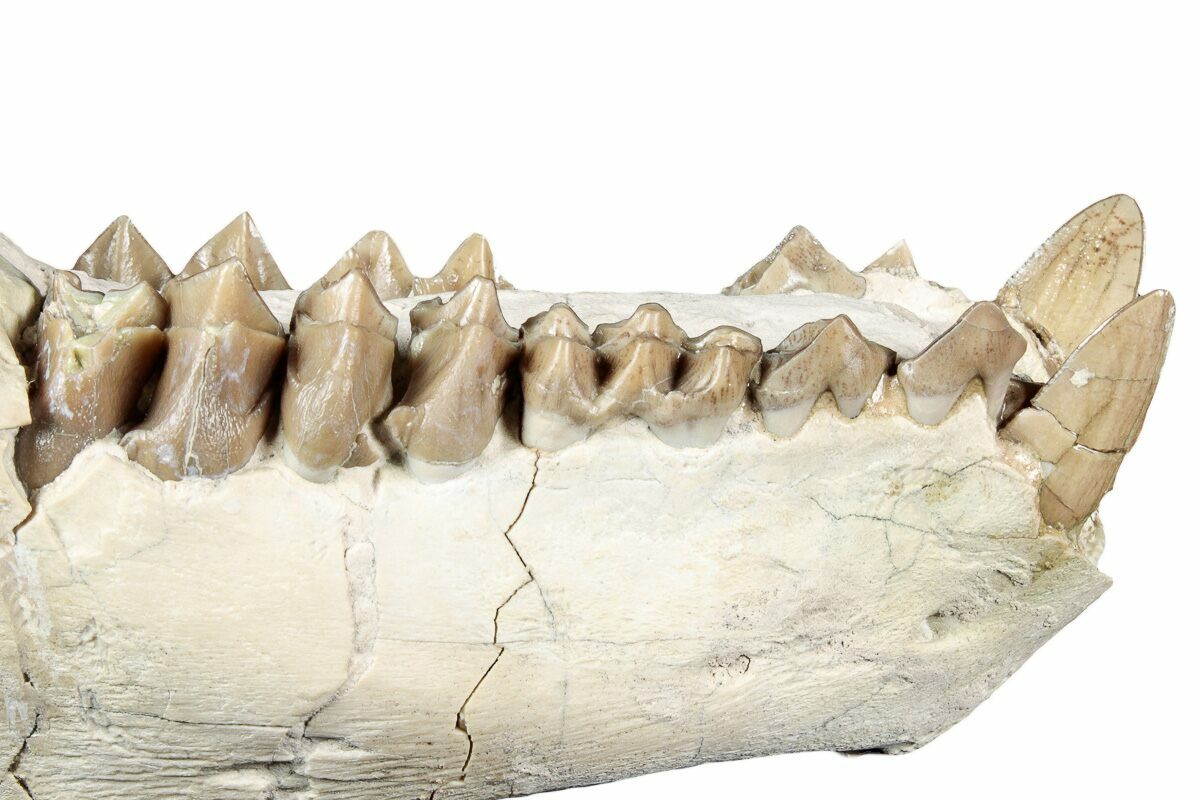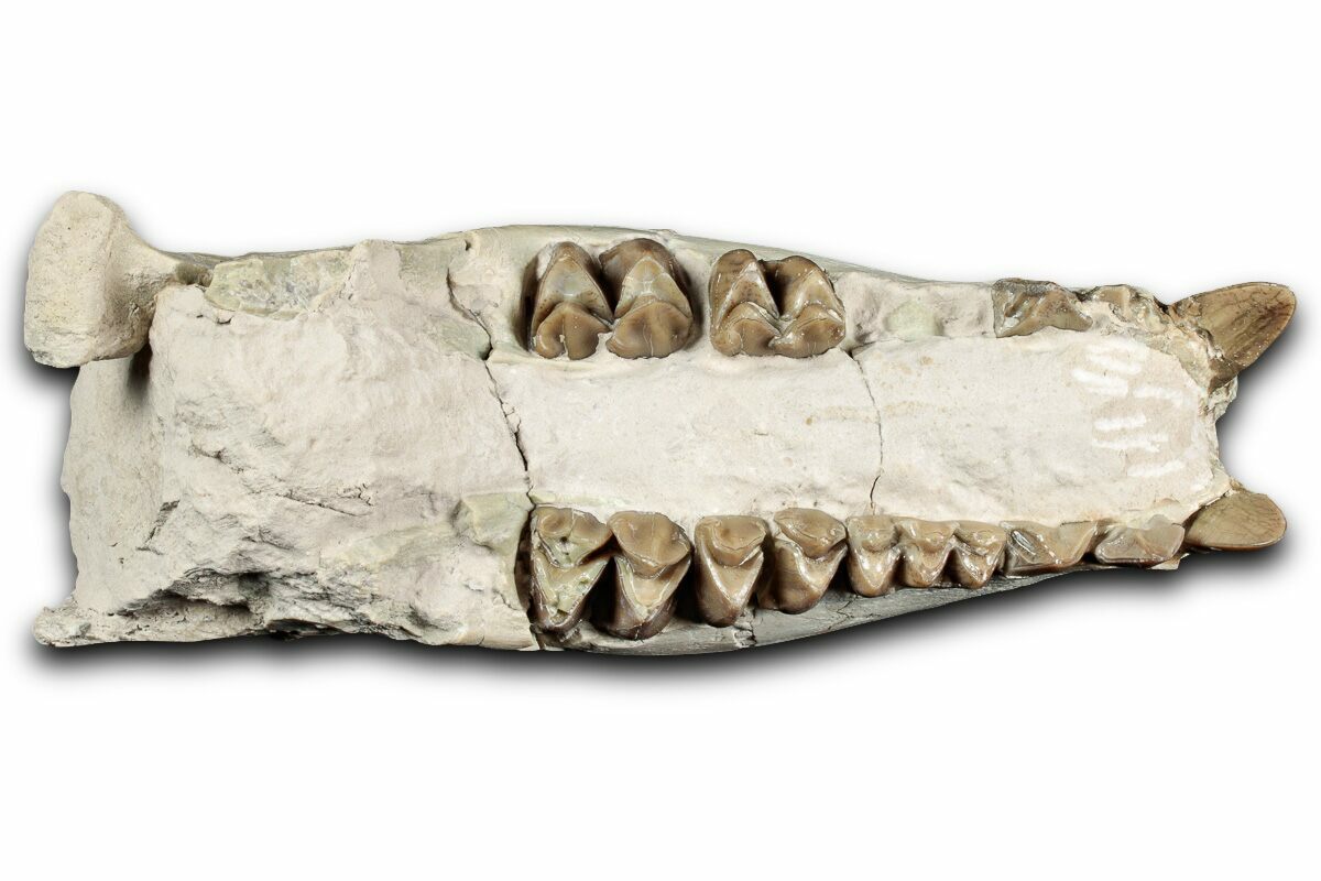 This is a 5.4" long mandible (lower jaw) of Merycoidodon, an oreodont from the oligocene-aged White River Formation of South Dakota. There are a few repaired cracks through the specimen and a section of rock has been left attached to the jaw for structural purposes. The base of the left canine has been restored with the remaining teeth being unrestored.