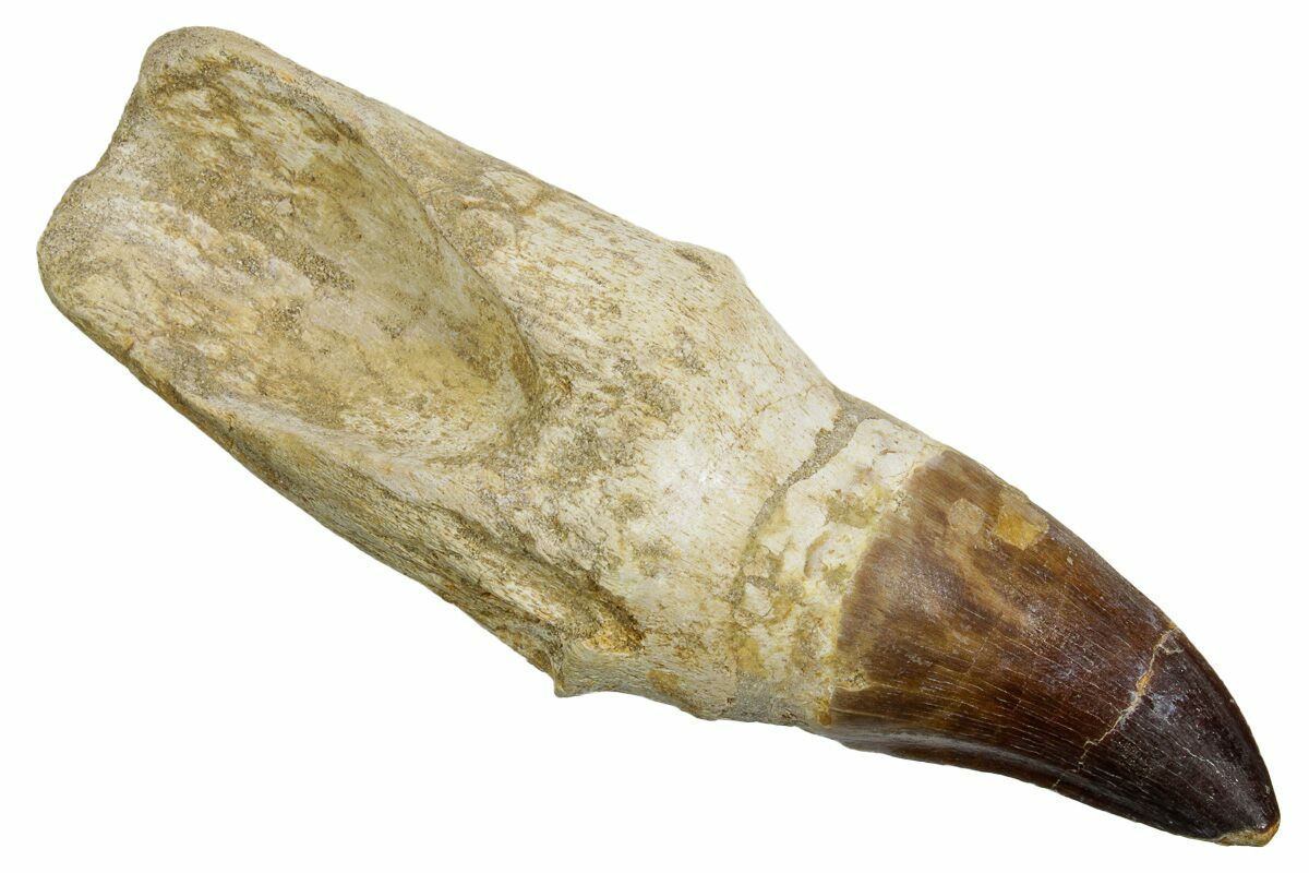 Rooted mosasaur teeth like this one are not common finds, as nearly all of the "rooted" teeth you see for sale have composite roots. The root on this one is natural, and it's well preserved. There are two repaired cracks through the tooth - one through the crown and the other through the root.