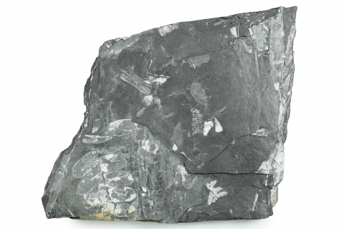 This is a plate of seed fern fossils from the Pennsylvanian aged (305 million year) Llewellyn formation of Pennsylvania. The white color of these detailed fern fossils contrasts well against the black shale they are preserved in. These plants were buried in a swamp where a low temperature, pressure, and oxygen environment the plant tissue was slowly replaced by pyrite. This pyrite was later replaced by a whitish mineral (aluminum silicate) as the fossils were buried and exposed to the heat and pressure inside of the earth.