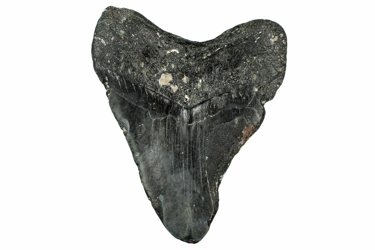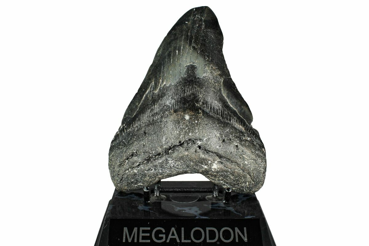 The standard measure for megalodon teeth is slant height, or the longest edge of the tooth. Adult megalodon teeth were typically in the 4 to 5 inch range: teeth over 6 inches are rare and represent super-sized individuals. Only a handful of teeth have ever been found over seven inches.