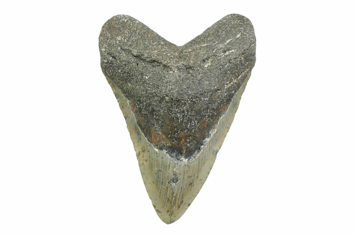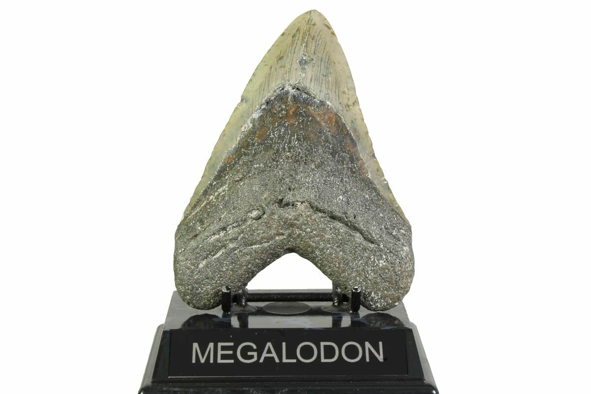 The standard measure for megalodon teeth is slant height, or the longest edge of the tooth. Adult megalodon teeth were typically in the 4 to 5 inch range: teeth over 6 inches are rare and represent super-sized individuals. Only a handful of teeth have ever been found over seven inches.
