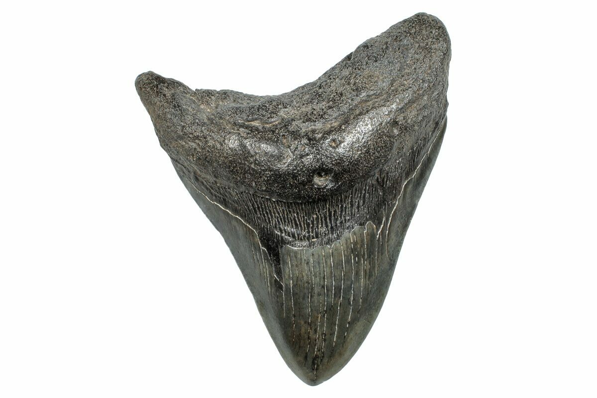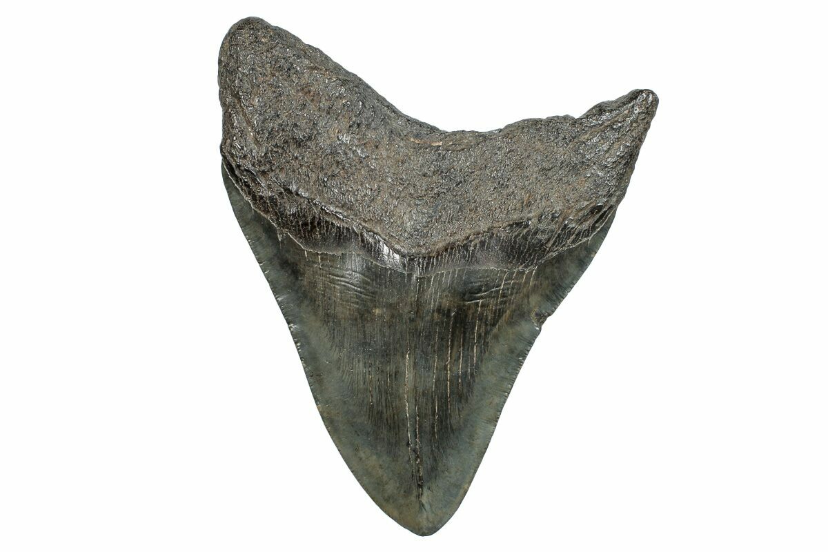 The standard measure for megalodon teeth is slant height, or the longest edge of the tooth. Adult megalodon teeth were typically in the 4 to 5 inch range: teeth over 6 inches are rare and represent super-sized individuals. Only a handful of teeth have ever been found over seven inches.