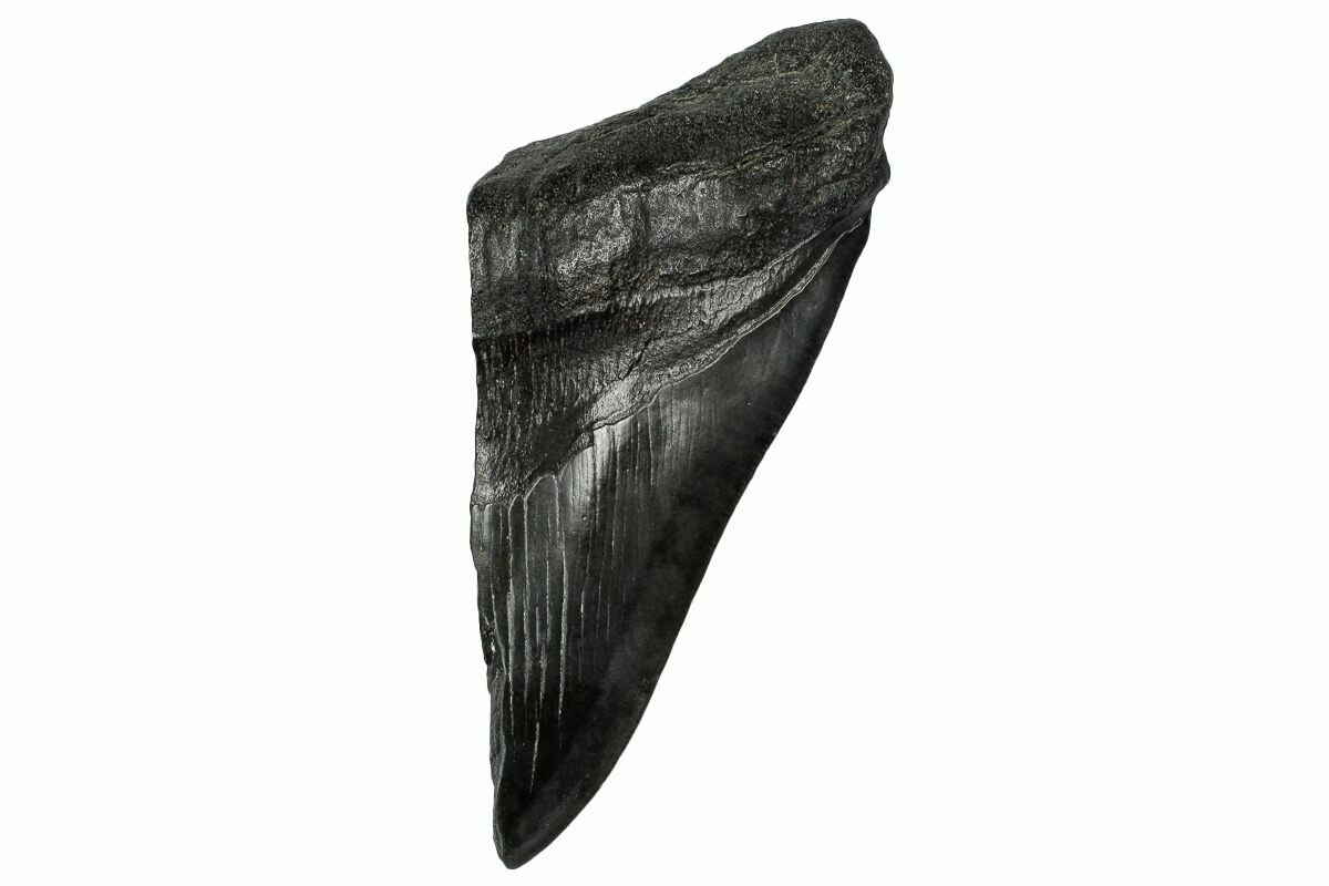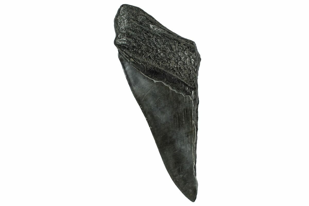 The standard measure for megalodon teeth is slant height, or the longest edge of the tooth. Adult megalodon teeth were typically in the 4 to 5 inch range: teeth over 6 inches are rare and represent super-sized individuals. Only a handful of teeth have ever been found over seven inches.