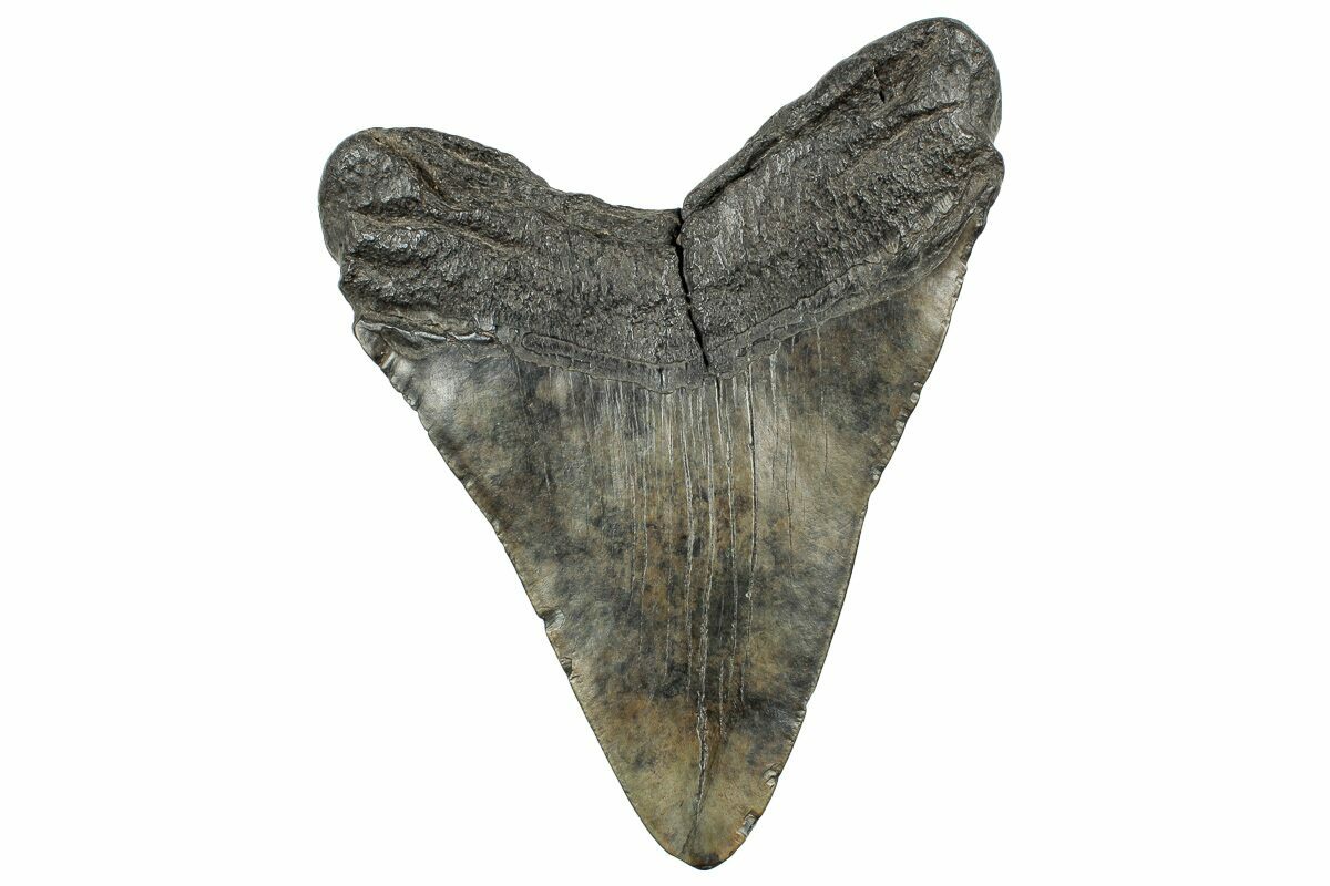 The standard measure for megalodon teeth is slant height, or the longest edge of the tooth. Adult megalodon teeth were typically in the 4 to 5 inch range: teeth over 6 inches are rare and represent super-sized individuals. Only a handful of teeth have ever been found over seven inches.