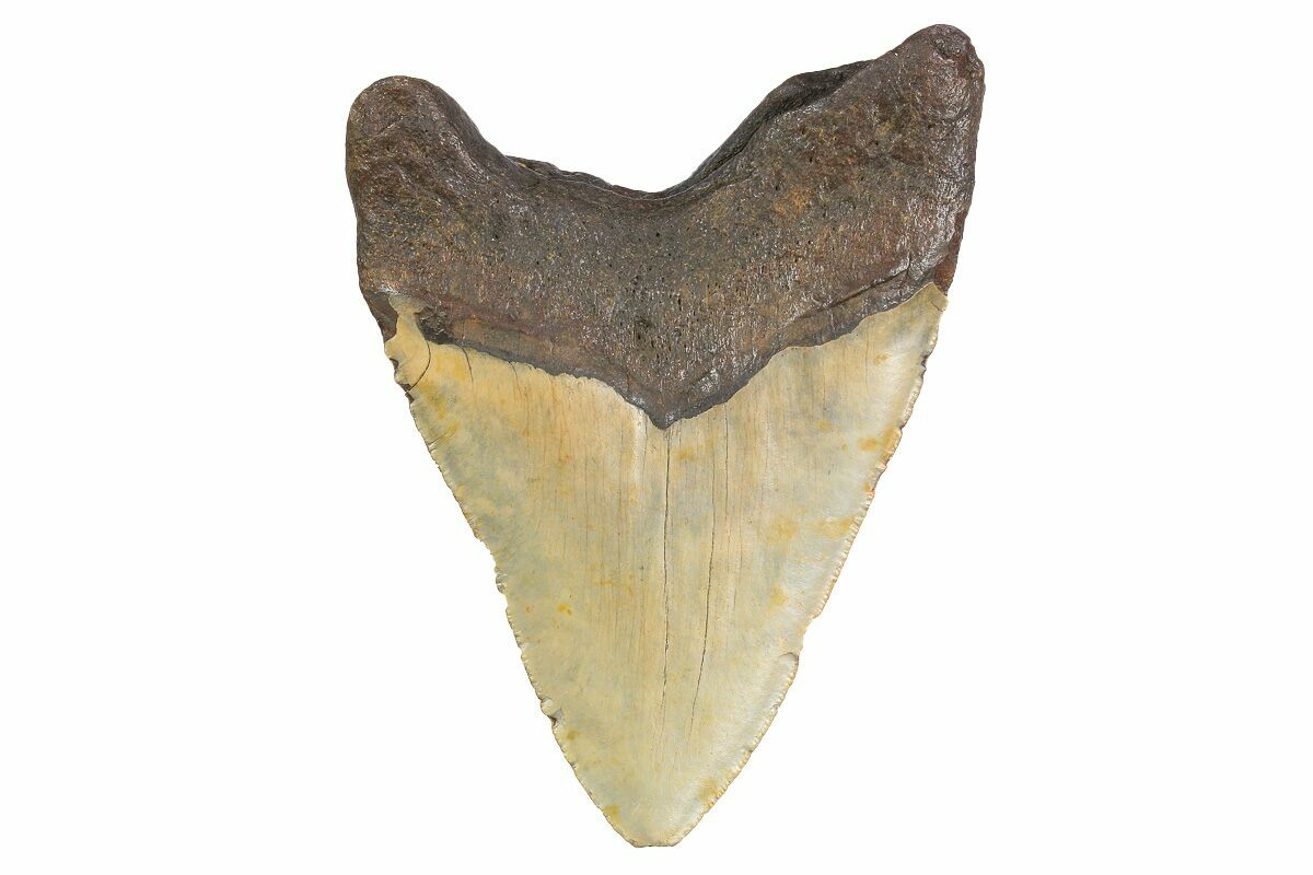 The standard measure for megalodon teeth is slant height, or the longest edge of the tooth. Adult megalodon teeth were typically in the 4 to 5 inch range: teeth over 6 inches are rare and represent super-sized individuals. Only a handful of teeth have ever been found over seven inches.