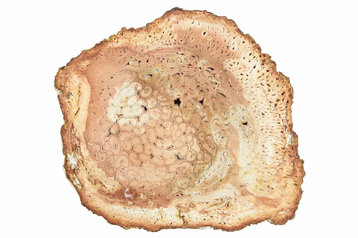 They are part of the ancient fern family Marattiaceae, whose extant members often have large fronds and fleshy root stocks. Tietea's unique characteristics are often revealed upon slicing and polishing trunk sections: their cross-sections reveal blobbish bundles of vascular tissue, used for nutrient transport, surrounded by sheaths of lignified (woody) cells. Specimens from the state of Tocantins in Brazil often include rich red-orange colorations, likely caused by iron impurities during fossilization.
