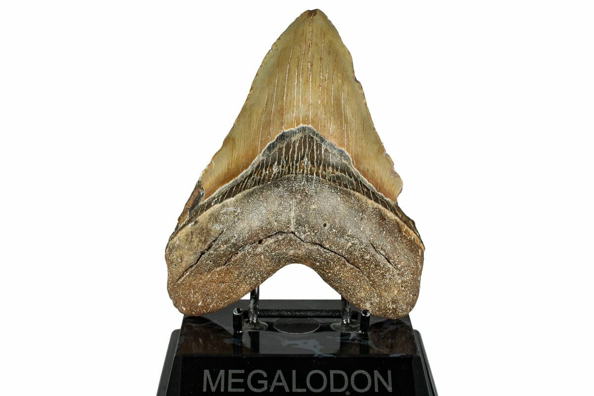The standard measure for megalodon teeth is slant height, or the longest edge of the tooth. Adult megalodon teeth were typically in the 4 to 5 inch range: teeth over 6 inches are rare and represent super-sized individuals. Only a handful of teeth have ever been found over seven inches.