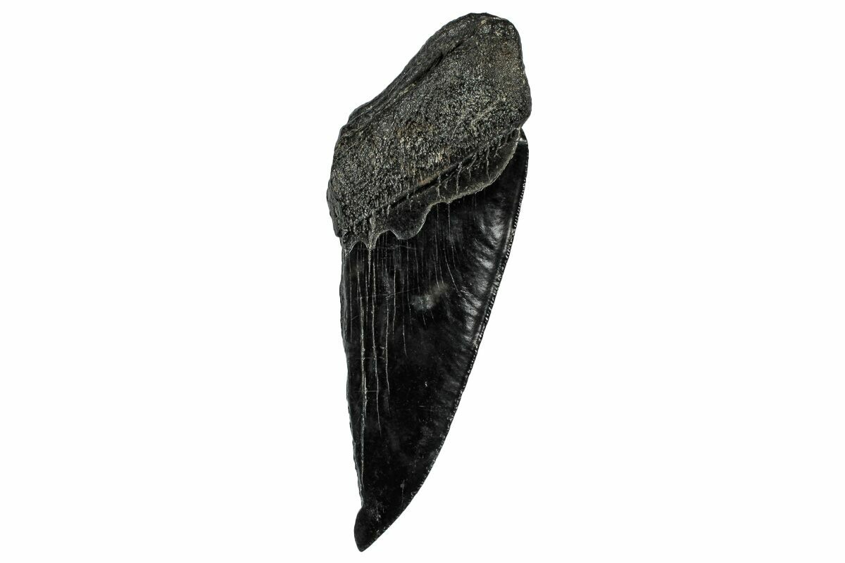 The standard measure for megalodon teeth is slant height, or the longest edge of the tooth. Adult megalodon teeth were typically in the 4 to 5 inch range: teeth over 6 inches are rare and represent super-sized individuals. Only a handful of teeth have ever been found over seven inches.