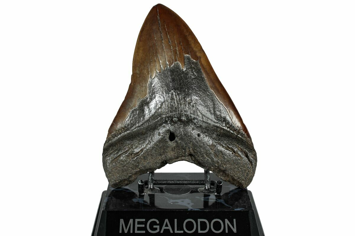 This is a 5.47" long, fossil megalodon tooth collected in South Carolina. The tooth would have come from an adult, prehistoric, mega-shark in the 40+ foot size range. It has a beautiful chocolate/coffee brown preservation.