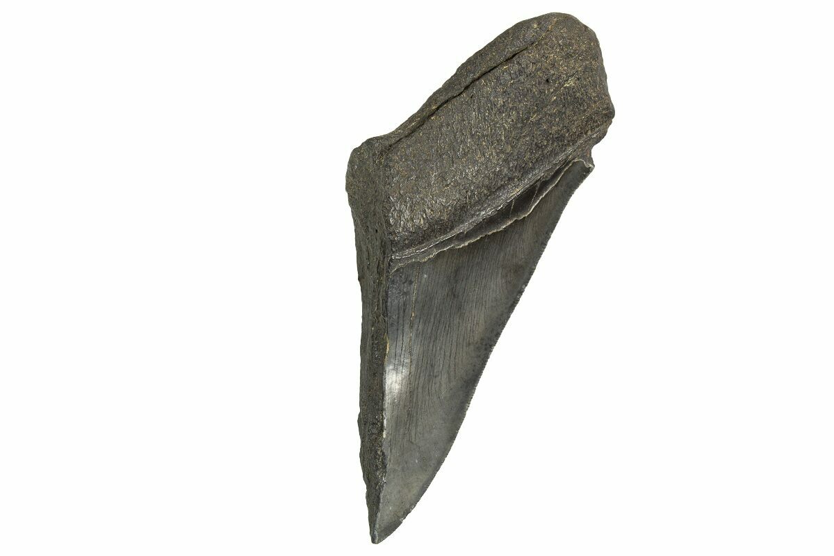 The standard measure for megalodon teeth is slant height, or the longest edge of the tooth. Adult megalodon teeth were typically in the 4 to 5 inch range: teeth over 6 inches are rare and represent super-sized individuals. Only a handful of teeth have ever been found over seven inches.