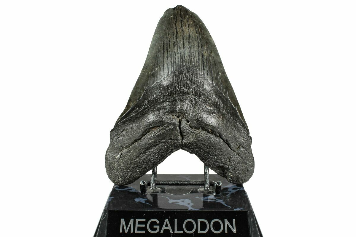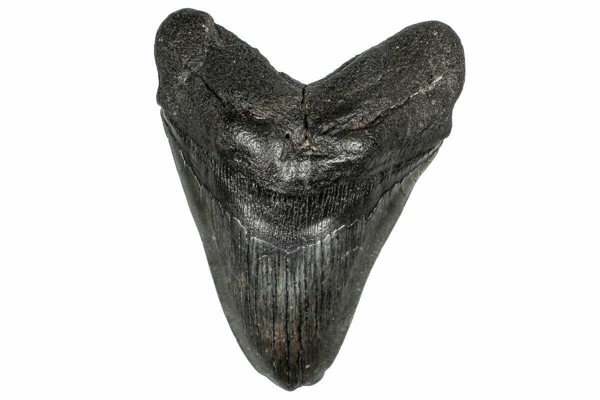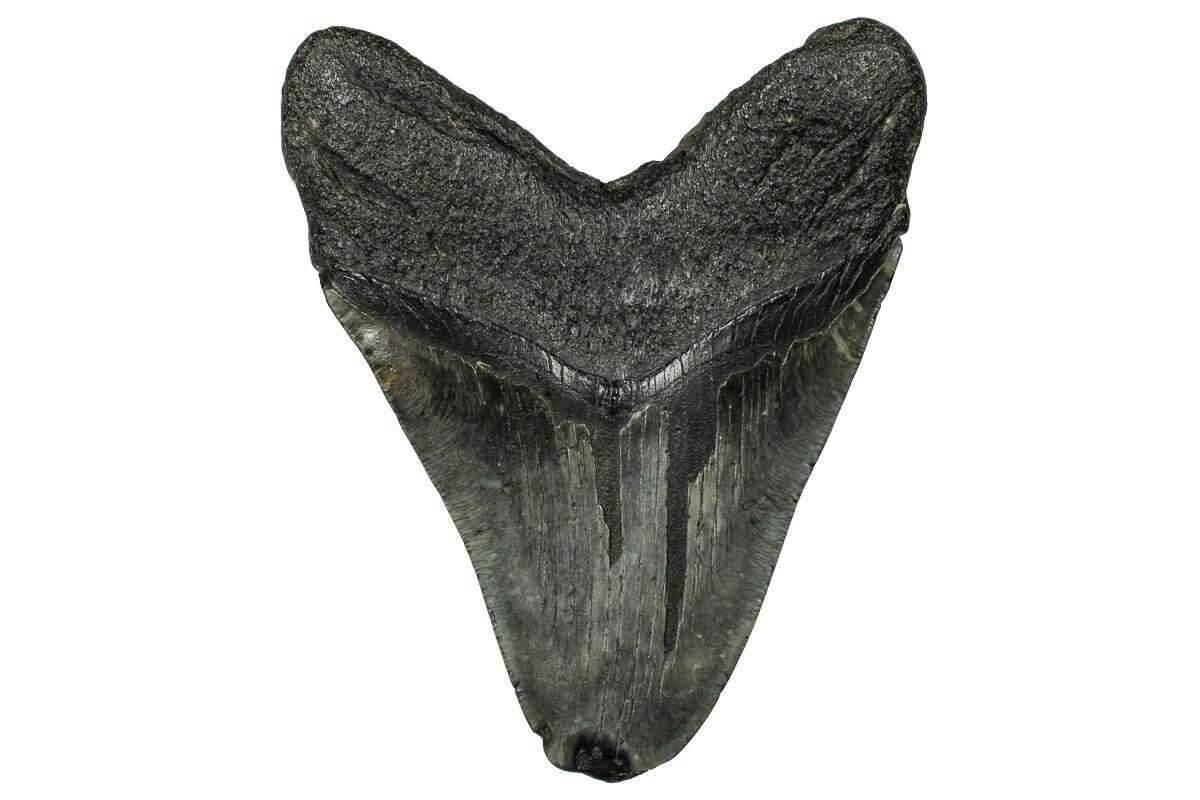 The standard measure for megalodon teeth is slant height, or the longest edge of the tooth. Adult megalodon teeth were typically in the 4 to 5 inch range: teeth over 6 inches are rare and represent super-sized individuals. Only a handful of teeth have ever been found over seven inches.