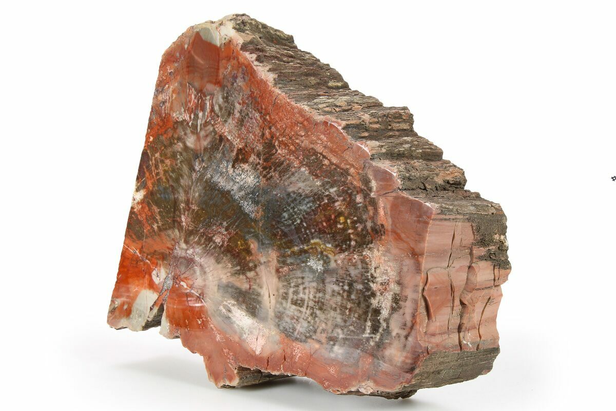 This is a beautiful, 5.5" tall standing section of Late Triassic petrified wood (Araucarioxylon) from Navajo County, Arizona. Details in the wood have been preserved in a myriad of reds, browns, and whites. One face has been cut flat and polished to a glossy finish, and the other side was left rough. The base has been cut flat so that it stands up nicely on a hard surface without the need for a display stand.