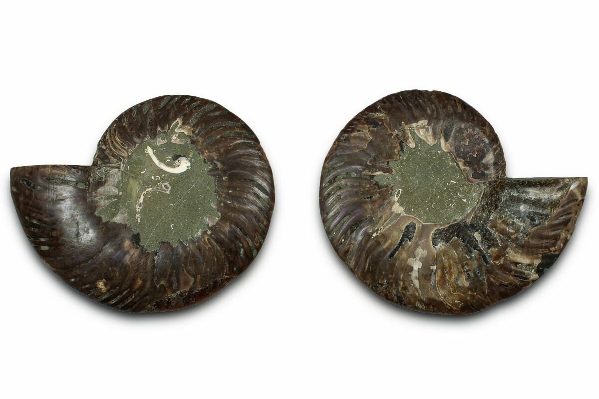 It exhibits gorgeous mineralization within the chambers, each separated by white calcite septa (divisions). This highly polished, exotic ammonite makes a superb display piece with tremendous historical appeal.