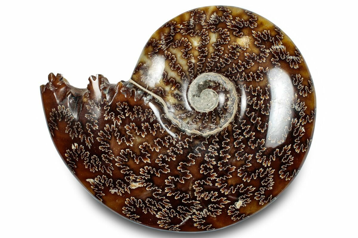 This is a 5.5" wide polished ammonite from Madagascar of the genus Cleoniceras. It is absolutely gorgeous, displaying a distinctive "oak-leaf" suture pattern on the surface. This 110 million year old ammonite is truly a natural work of art and is very displayable on the included acrylic stand. The sutures on it have been meticulously exposed and cleaned making the ammonite look that much nicer.