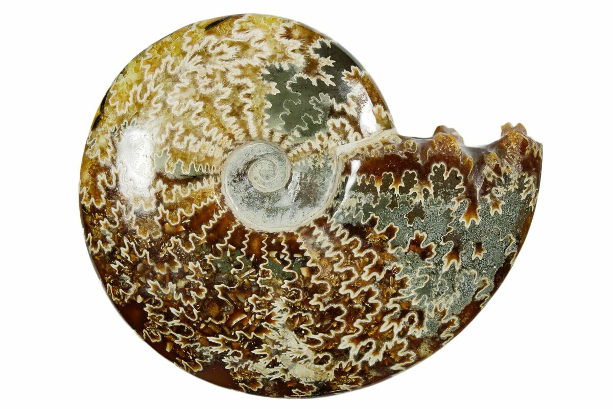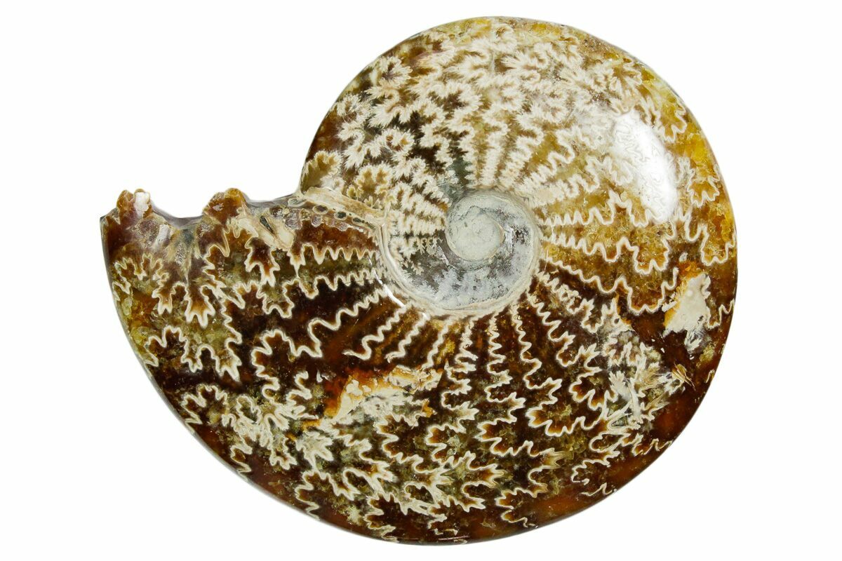 This is a 5.5" wide polished ammonite of the genus Cleoniceras, collected in Madagascar. It is absolutely gorgeous, displaying a distinctive "oak-leaf" suture pattern on the surface. This 110 million year old ammonite is truly a natural work of art, with the end chamber having been exposed.
