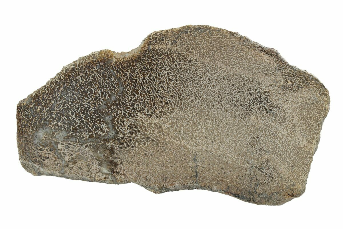 This is a 5.5" wide slab of agatized dinosaur bone that has been polished on both sides to expose the inner cell structure. It has wonderful coloration and the cell structure is very well defined. Based on the size of the cells as well as other features of the bone it is almost certainly sauropod in origin.