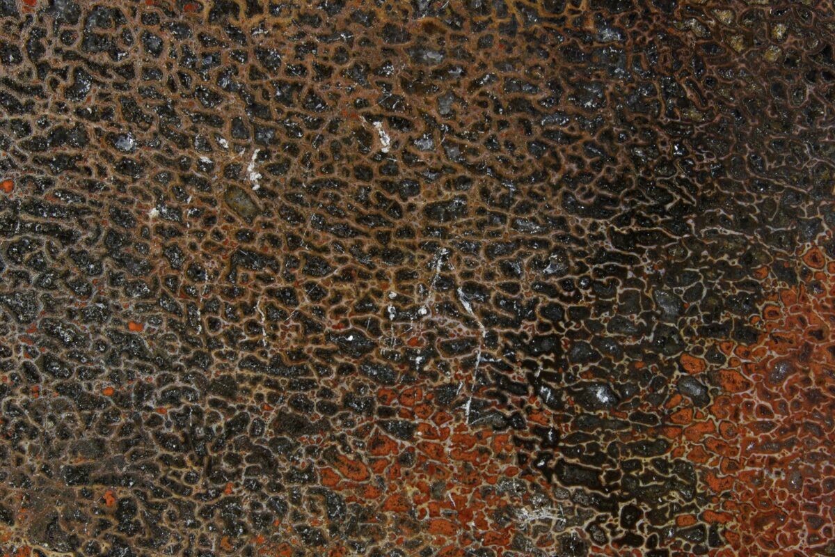 Dinosaur gembone (agatized dinosaur bone) forms when the porous structure of dinosaur bone is replaced by silica-rich minerals like agate, chalcedony, or jasper. This preserves the bone’s internal cell patterns, creating striking, web-like textures visible when polished.