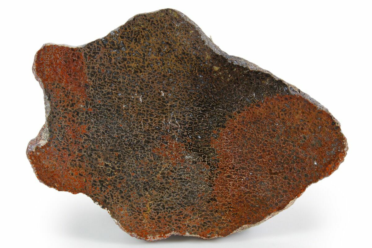 This is a very vibrant, 5.5" wide slab of polished agatized dinosaur bone (gembone) from the Morrison Formation in New Mexico. Beautiful bright red colored cells on this specimen. It is cut flat on both sides and polished to a glossy finish on one.
