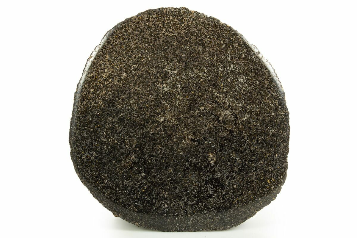 This is a 5.5" wide Iguanodon vertebra end-cut showing stunning internal cell structure. It was collected from the Lower Cretaceous-aged Wealden Clay on the Isle of Wight. While complete or near complete bones are rare, water tumbled chunks are often found after they erode out of the cliffs on the isle. This is a piece of a large vertebra that has been cut flat and polished to a glossy finish on one side.