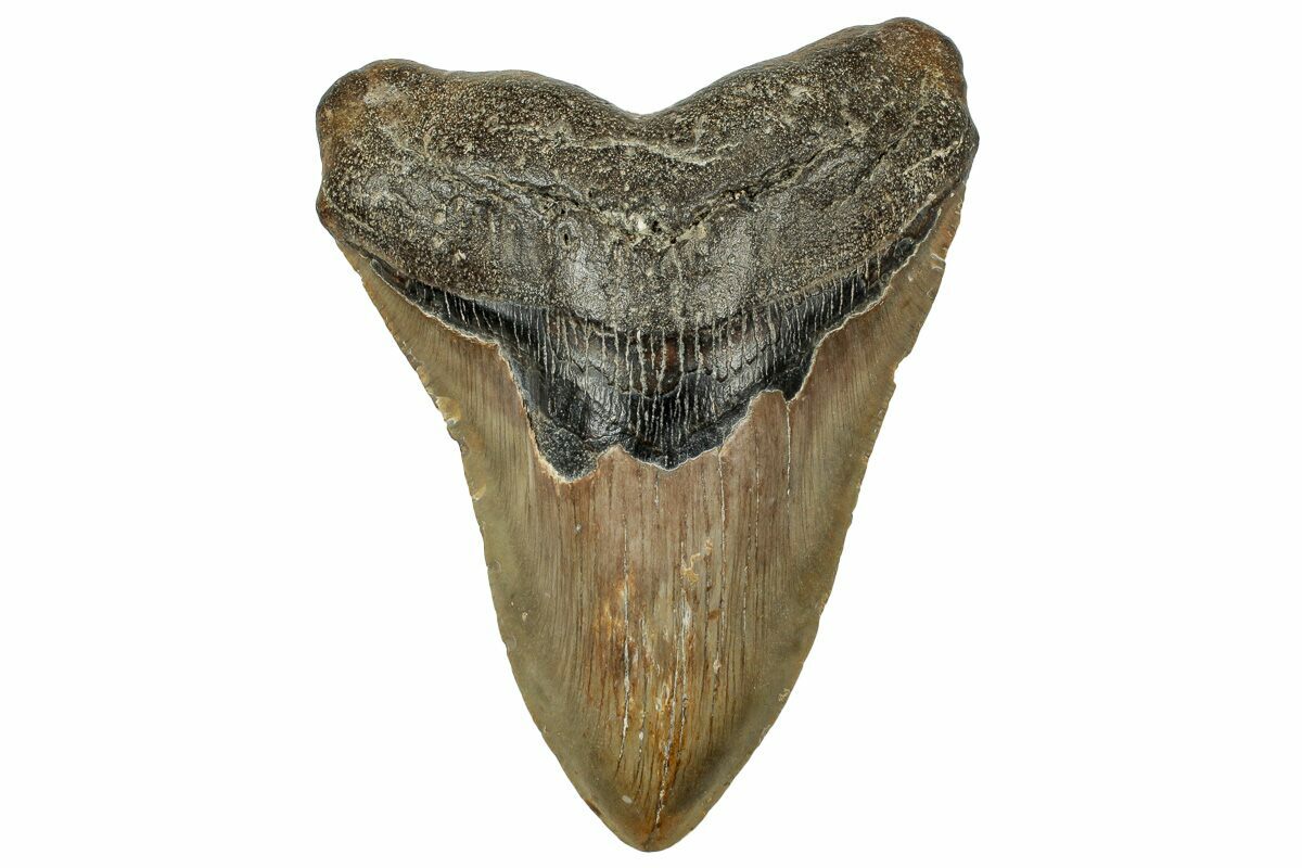 The standard measure for megalodon teeth is slant height, or the longest edge of the tooth. Adult megalodon teeth were typically in the 4 to 5 inch range: teeth over 6 inches are rare and represent super-sized individuals. Only a handful of teeth have ever been found over seven inches.