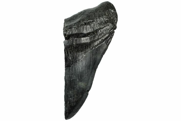 The standard measure for megalodon teeth is slant height, or the longest edge of the tooth. Adult megalodon teeth were typically in the 4 to 5 inch range: teeth over 6 inches are rare and represent super-sized individuals. Only a handful of teeth have ever been found over seven inches.