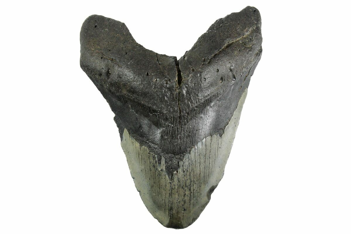This is a large, 5.54" fossil Megalodon tooth collected in from a river in South Carolina after it eroded out of the Hawthorn Formation. A tooth of this size would have come from an adult Megalodon shark in the 40 foot size range.