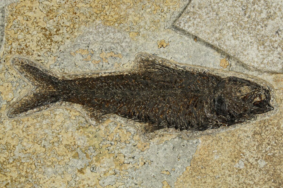 Specimens like this come from the coveted 18 inch layer of the Green River Formation, which produces darker and more detailed fish than the majority on the market. The rock from this layer is much harder and more durable than other layers in the formation, likely due to its initial deposition conditions in deep water. Because of these conditions, fish found in the 18-inch layer can be extracted whole and in excellent condition. This layer is typically collected at night using low-angle light to see the bump in the rock that the fish's backbone creates. They then cut these fish out and take them to a lab where the fish, which may be up to an inch under the surface of the rock, are meticulously extracted under microscope with hand tools.
