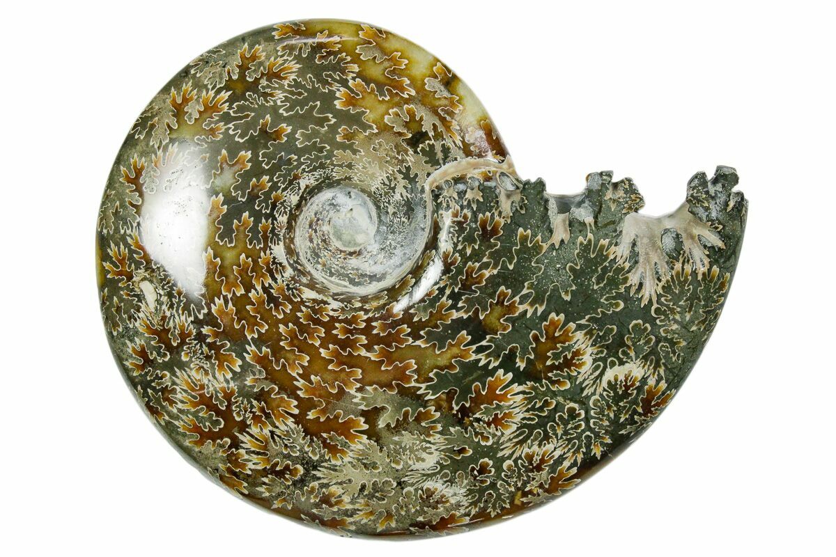 This is a 5.55" wide polished ammonite of the genus Cleoniceras, collected in Madagascar. It is absolutely gorgeous, displaying a distinctive "oak-leaf" suture pattern on the surface. This 110 million year old ammonite is truly a natural work of art, with the end chamber having been exposed.