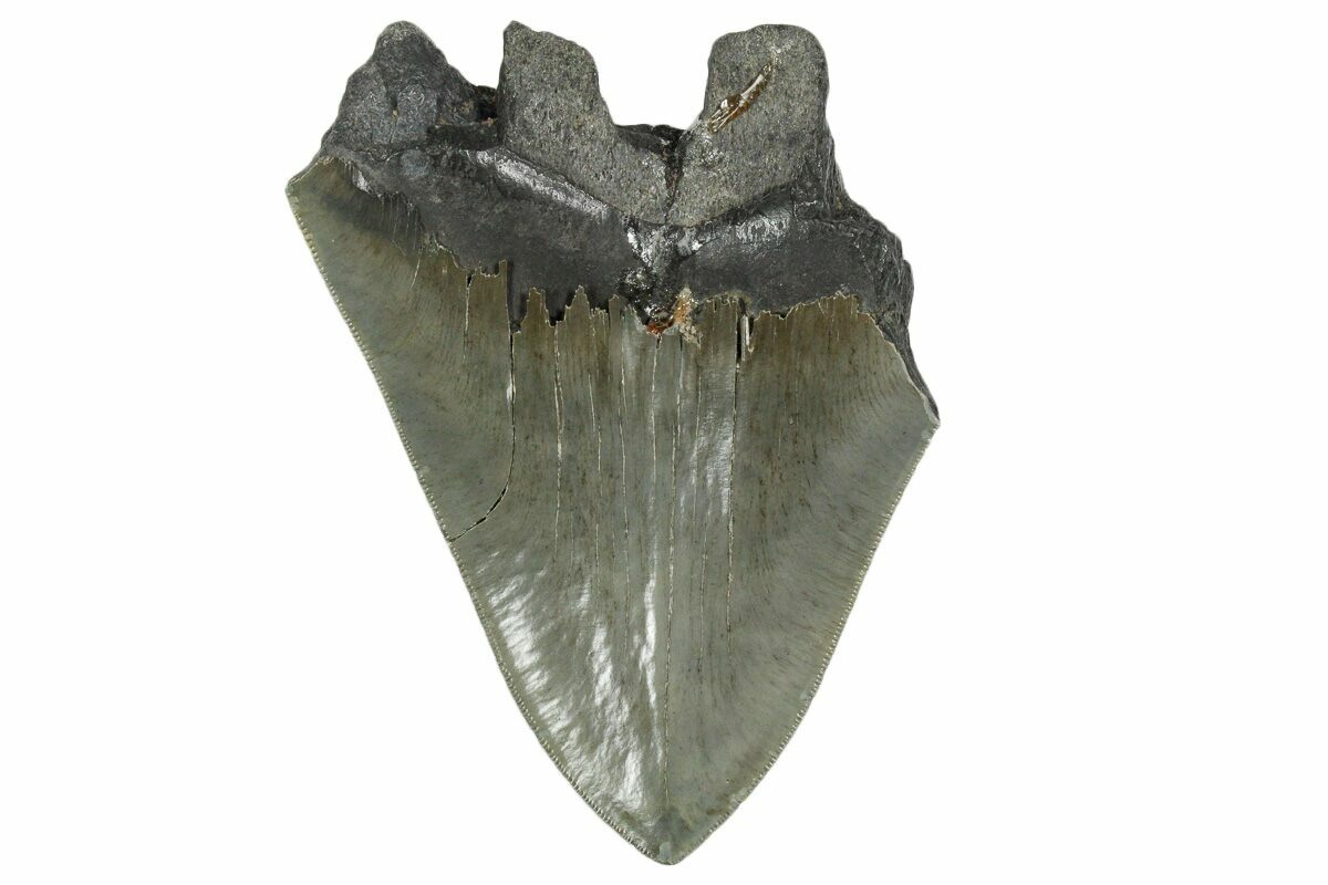 This is a partial, 5.57" fossil Megalodon tooth collected from the Hawthorn Formation in Georgia. Given the size of this tooth, it would have come from a prehistoric, mega-shark in the 40+ foot size range.