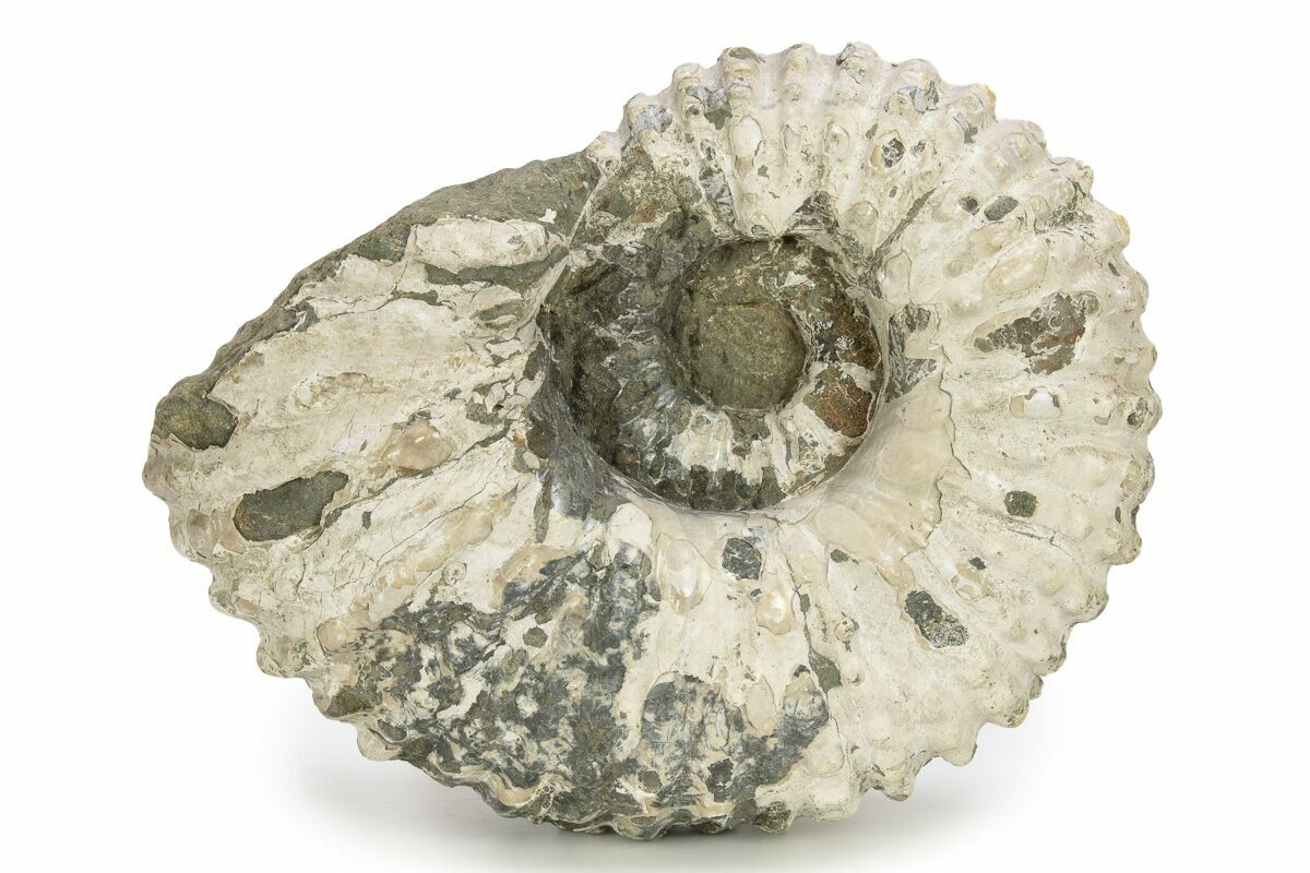 This is a nice Douvilleiceras ammonite from the Upper Cretaceous, collected in Madagascar. This genus of ammonites has a distinctively bumpy surface and pronounced ridges, resembling a tractor tire; hence their nickname as "Tractor Ammonites".