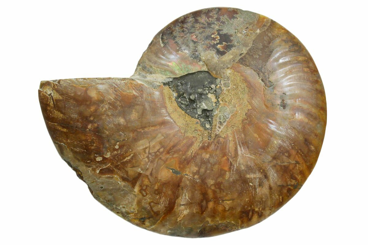 Here is a beautiful, 5.6" wide, cut and polished Cleoniceras ammonite fossil from Madagascar. These ammonites are Cretaceous in age, approximately 110 million years old. This specimen exhibits gorgeous mineralization within the chambers, each separated by white calcite septa (divisions). This highly polished, exotic ammonite makes a superb display piece with tremendous historical appeal.