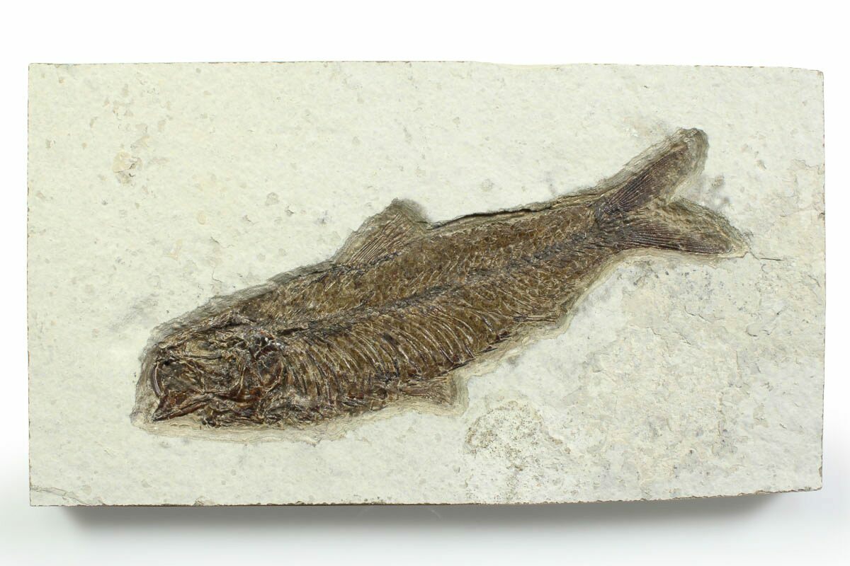 This is a nicely preserved 5.6" long fossil fish (Knightia eocaena) from the Eocene-aged Green River Formation in Wyoming. It is well-detailed and prepared with bone structure, fins, and scale structure visible. The fish is nicely centered on a rectangular cut slab of rock