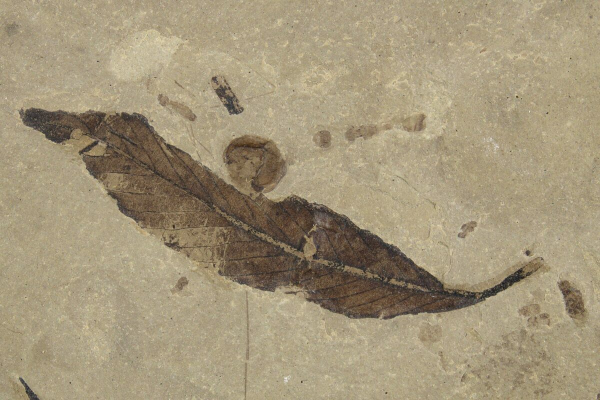 This is an amazing, 5.6" wide piece of shale that contains two fossil leaves (Mimosites coloradensis & Cedrelospermum nervosum), crane flies (family Tipulidae, and a fly (order Diptera). The specimen was collected from the Green River Formation of Uintah County, Utah. While this formation is best known for well preserved fossil fish found in Wyoming, other sections of the formation contain a very diverse flora and insect fauna.