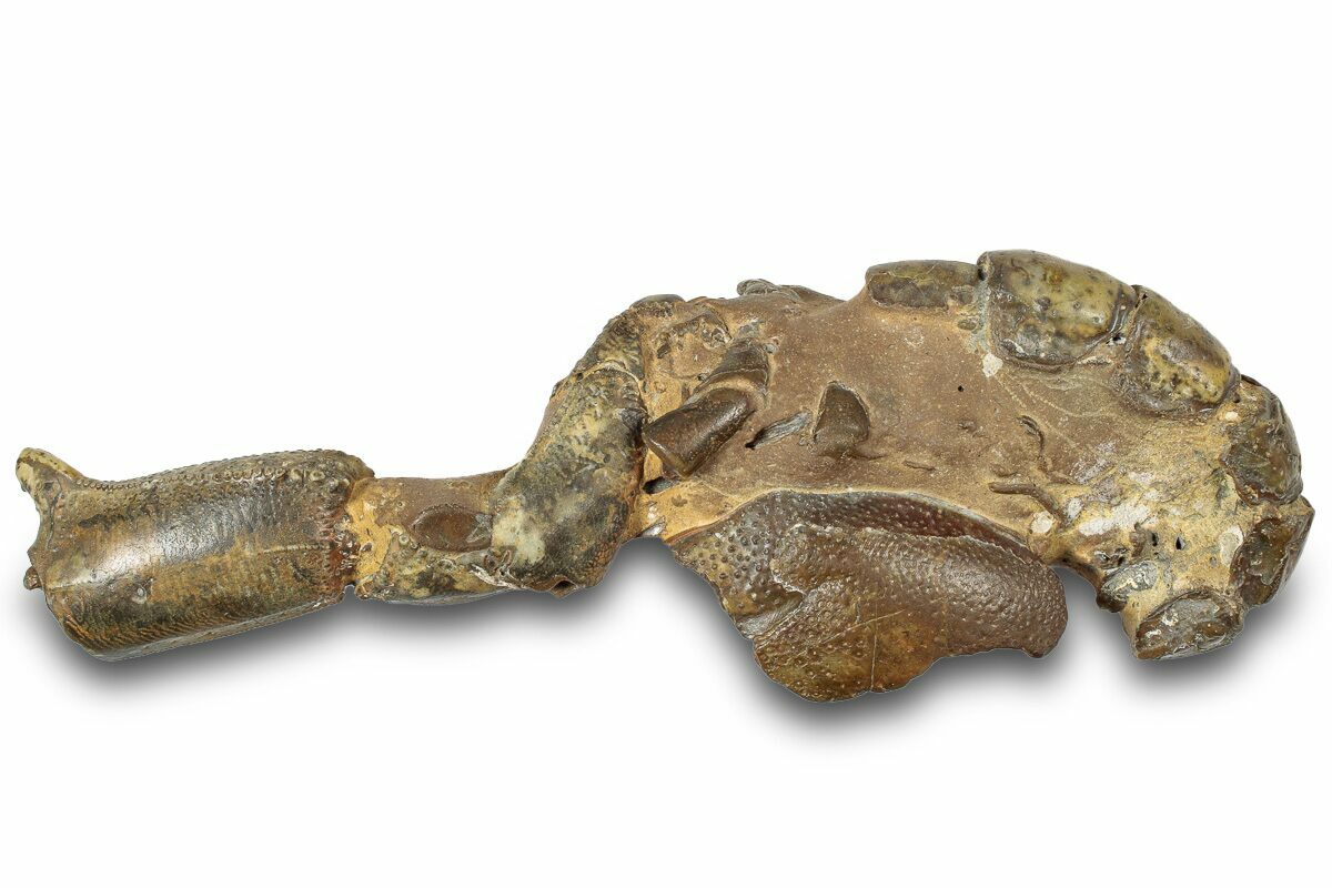 This is a 5.6" long fossil mud/mangrove lobster (Thalassina anomala) collected from Gunn Point in Australia. The carapace, legs and one claw is visible having been prepared from the surrounding concretion.