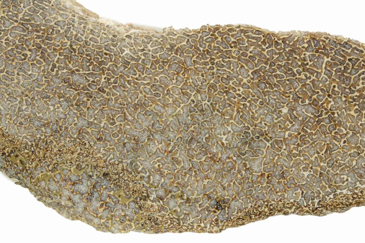 This is a 5.6" wide section of agatized dinosaur bone that has been cut and polished on one side to expose the inner cell structure. It has wonderful coloration and interesting structures. Based on the size of the cells as well as other features of the bone, it is almost certainly sauropod in origin.
