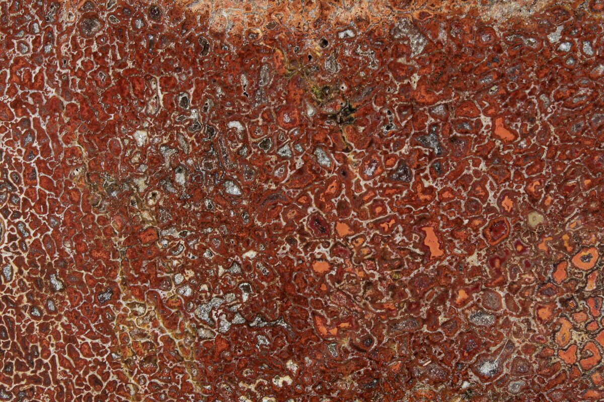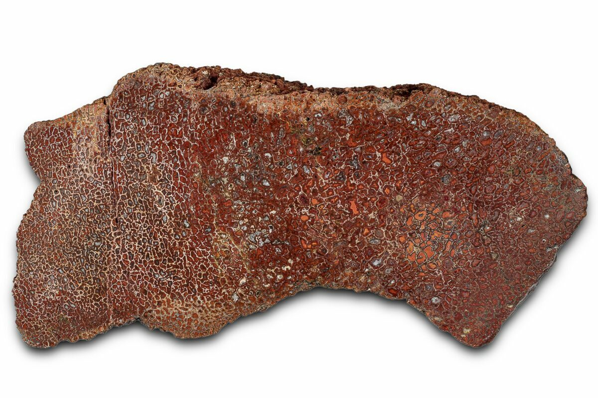 Dinosaur gembone (agatized dinosaur bone) forms when the porous structure of dinosaur bone is replaced by silica-rich minerals like agate, chalcedony, or jasper. This preserves the bone’s internal cell patterns, creating striking, web-like textures visible when polished.