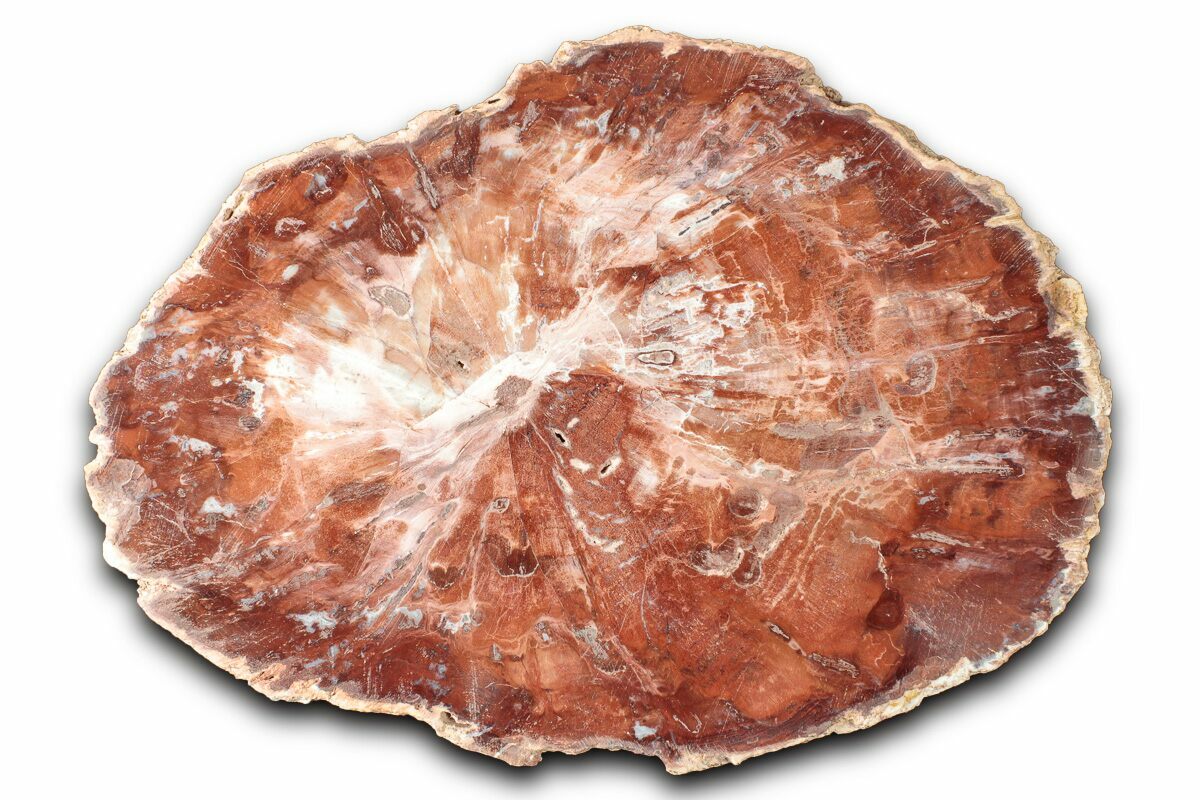 Madagascar petrified wood comes primarily from extensive Triassic-aged deposits in the Mahajanga Basin of northwestern Madagascar, where ancient conifer forests—often attributed to species related to Araucarioxylon—were buried by volcanic ash and floodplain sediments roughly 225–240 million years ago. Over immense spans of time, silica-rich fluids percolated through these sediments, replacing the cellular structure of the wood with chalcedony, jasper, agate, and quartz while preserving growth rings, bark textures, and even microscopic details. The region’s unique geochemistry—especially its iron, manganese, and occasionally copper content—produces the vivid palette Madagascar petrified wood is famous for, including deep brick reds, golden yellows, smoky blacks, and pastel pinks. Many logs are found fully silicified and naturally fractured into large, rounded segments that local artisans cut into slabs, spheres, eggs, and freeforms. These deposits stretch across arid badlands where erosion steadily exposes new material, making Madagascar one of the world’s premier sources of highly colorful, beautifully patterned fossil wood.