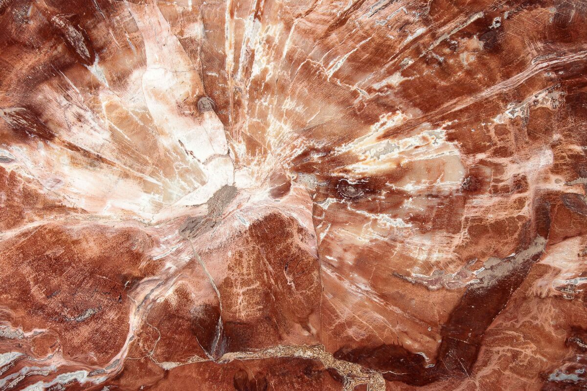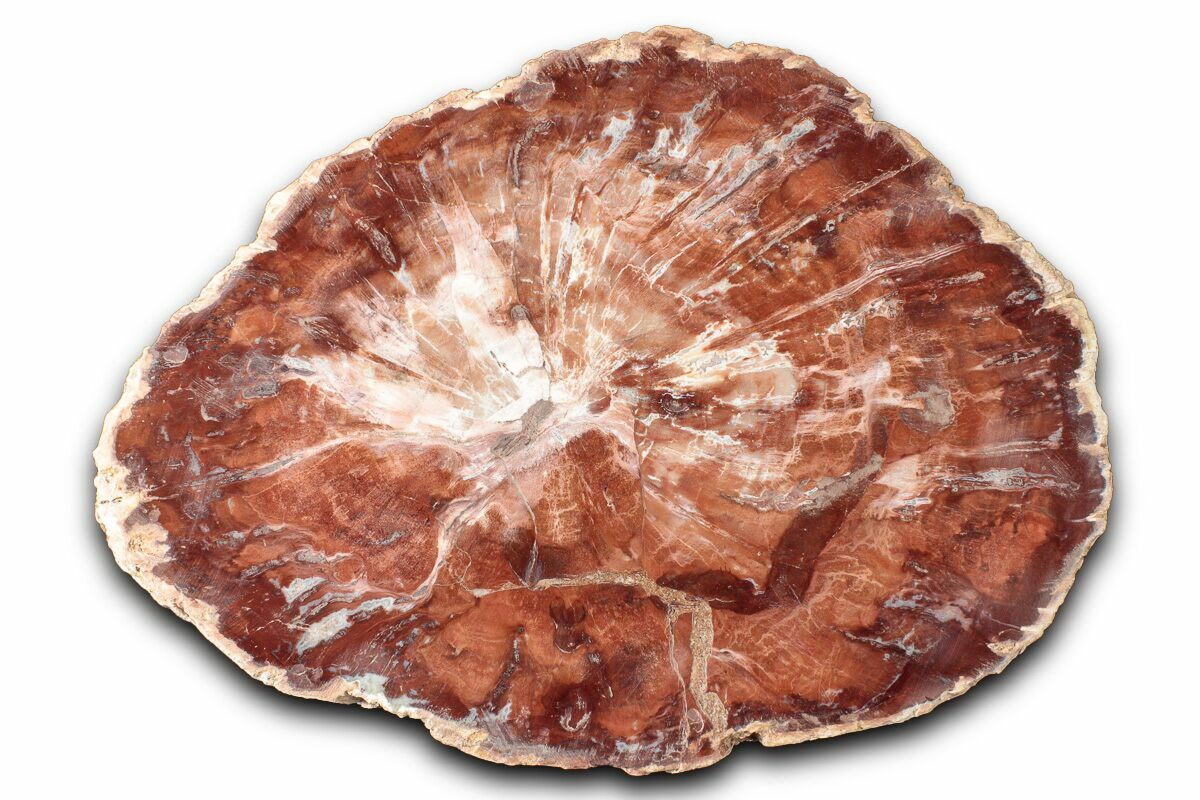 Madagascar petrified wood comes primarily from extensive Triassic-aged deposits in the Mahajanga Basin of northwestern Madagascar, where ancient conifer forests—often attributed to species related to Araucarioxylon—were buried by volcanic ash and floodplain sediments roughly 225–240 million years ago. Over immense spans of time, silica-rich fluids percolated through these sediments, replacing the cellular structure of the wood with chalcedony, jasper, agate, and quartz while preserving growth rings, bark textures, and even microscopic details. The region’s unique geochemistry—especially its iron, manganese, and occasionally copper content—produces the vivid palette Madagascar petrified wood is famous for, including deep brick reds, golden yellows, smoky blacks, and pastel pinks. Many logs are found fully silicified and naturally fractured into large, rounded segments that local artisans cut into slabs, spheres, eggs, and freeforms. These deposits stretch across arid badlands where erosion steadily exposes new material, making Madagascar one of the world’s premier sources of highly colorful, beautifully patterned fossil wood.