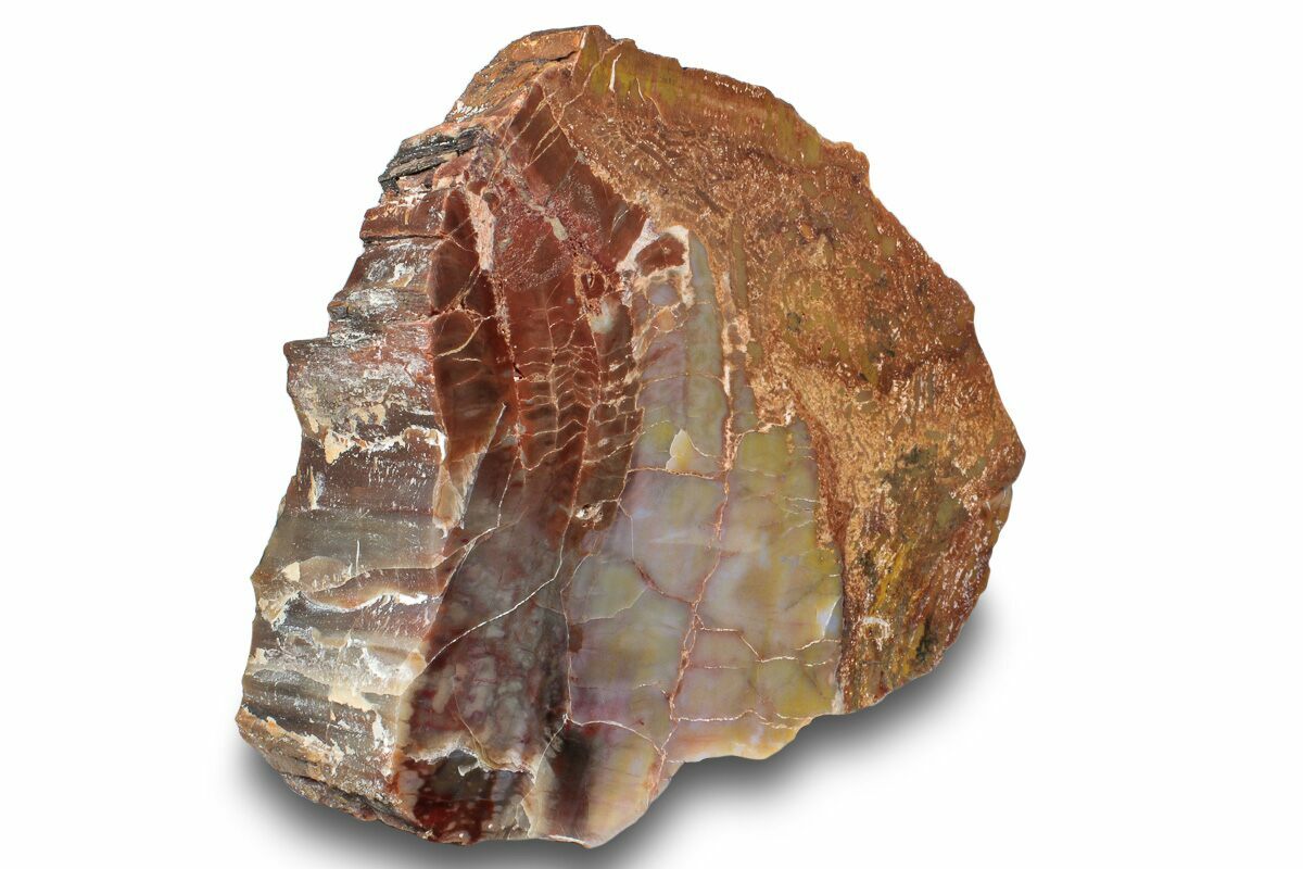This is a brilliantly colored, 5.6" wide section of petrified wood (Araucarioxylon) from Arizona. One side of the petrified has been polished to a glossy finish, while the exterior surface has a natural texture.