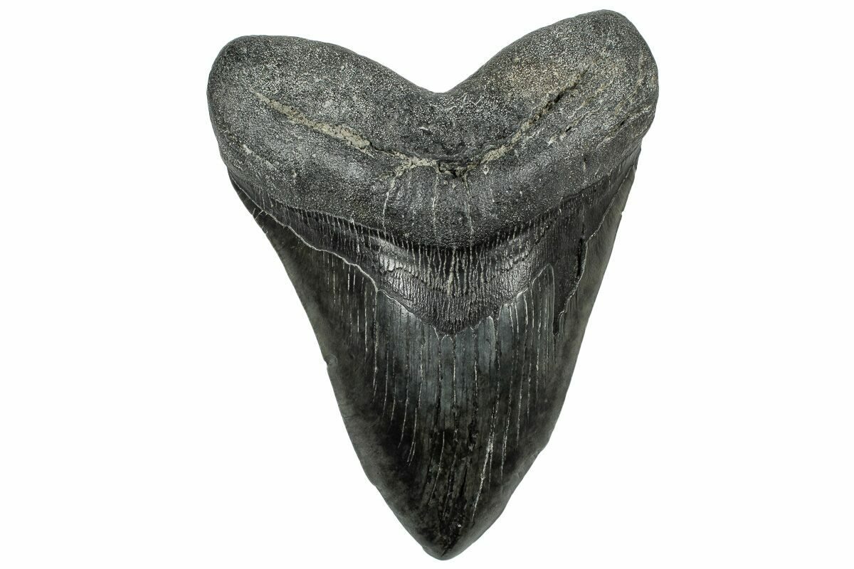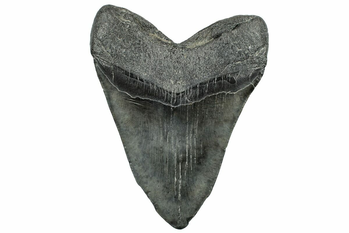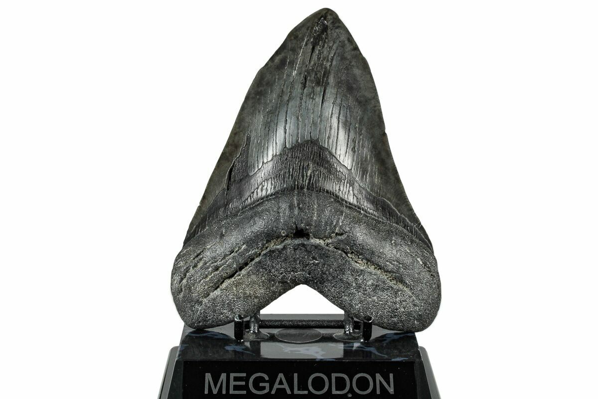 The standard measure for megalodon teeth is slant height, or the longest edge of the tooth. Adult megalodon teeth were typically in the 4 to 5 inch range: teeth over 6 inches are rare and represent super-sized individuals. Only a handful of teeth have ever been found over seven inches.