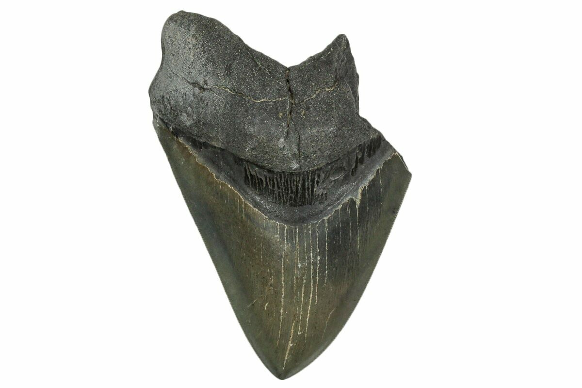 The standard measure for megalodon teeth is slant height, or the longest edge of the tooth. Adult megalodon teeth were typically in the 4 to 5 inch range: teeth over 6 inches are rare and represent super-sized individuals. Only a handful of teeth have ever been found over seven inches.