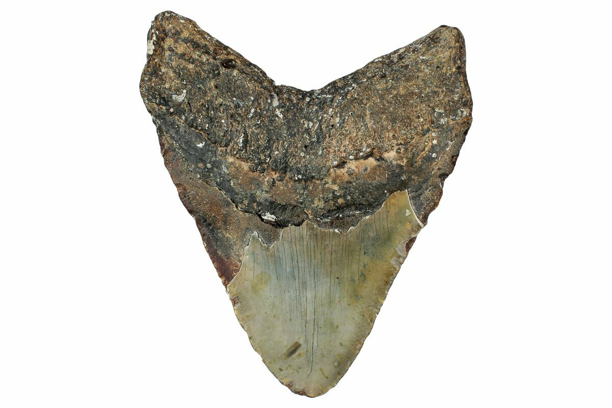 The standard measure for megalodon teeth is slant height, or the longest edge of the tooth. Adult megalodon teeth were typically in the 4 to 5 inch range: teeth over 6 inches are rare and represent super-sized individuals. Only a handful of teeth have ever been found over seven inches.
