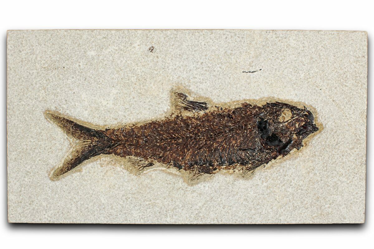 This is a nicely preserved 5.7" long fossil fish (Knightia eocaena) from the Eocene-aged Green River Formation in Wyoming. It comes out of the 18 inch layer which produces beautifully preserved fish. It is well-detailed and prepared with bone structure, fins, and scale structure visible. The fish is nicely centered on a rectangular cut slab of rock